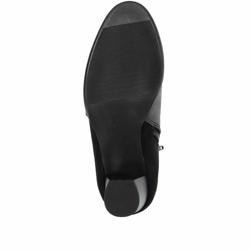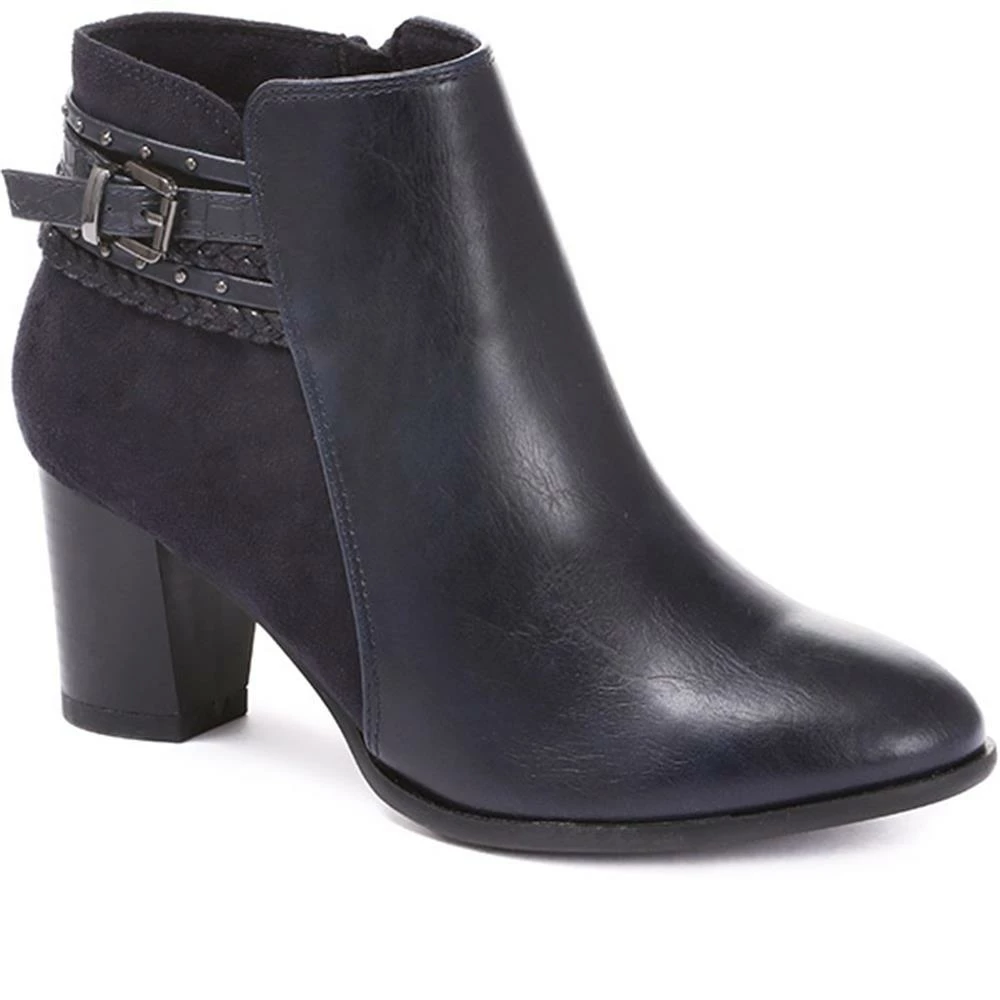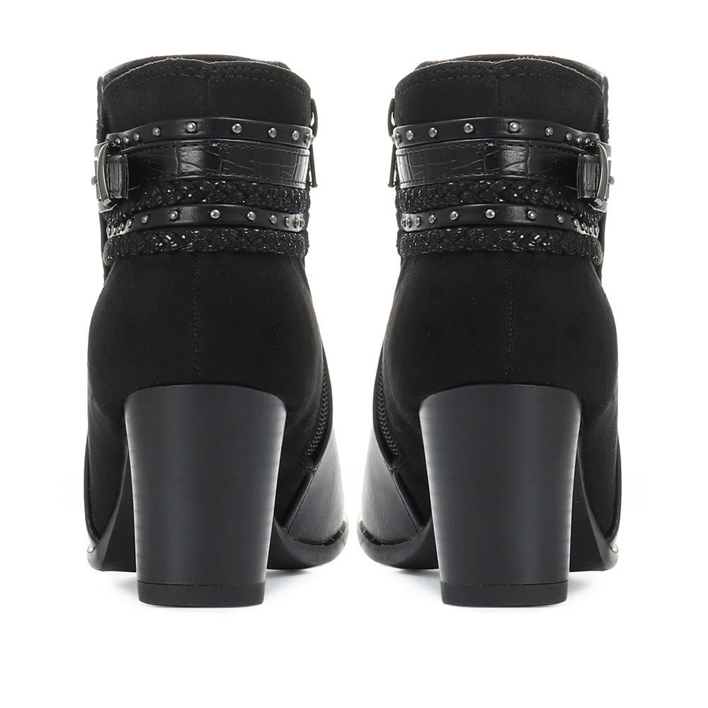 The perfect heeled ankle boot that can take you from dressy days to elegant evenings, styled with a multi strap detailing across the heel and a duo of smooth faux leather and suedette. Soft padded linings and a cushioned footbed provides the essential comfort support you need for all-day wear.
