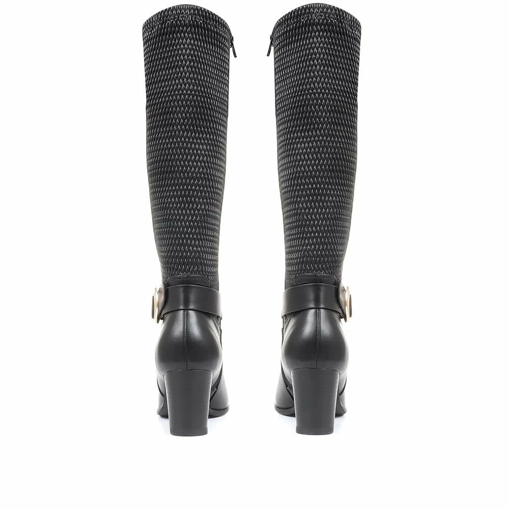 Made with a stretchy calf panel, these knee high boots promise the perfect fit every time.Styled with a smart, sophisticated, and versatile silhouette these boots look great worn over jeans or tucked under your dresses and skirts. Adding a more comfortable lift to your height, these boots are equipped with a chunky block heel that will distribute the weight across your heel and the ball of your foot.