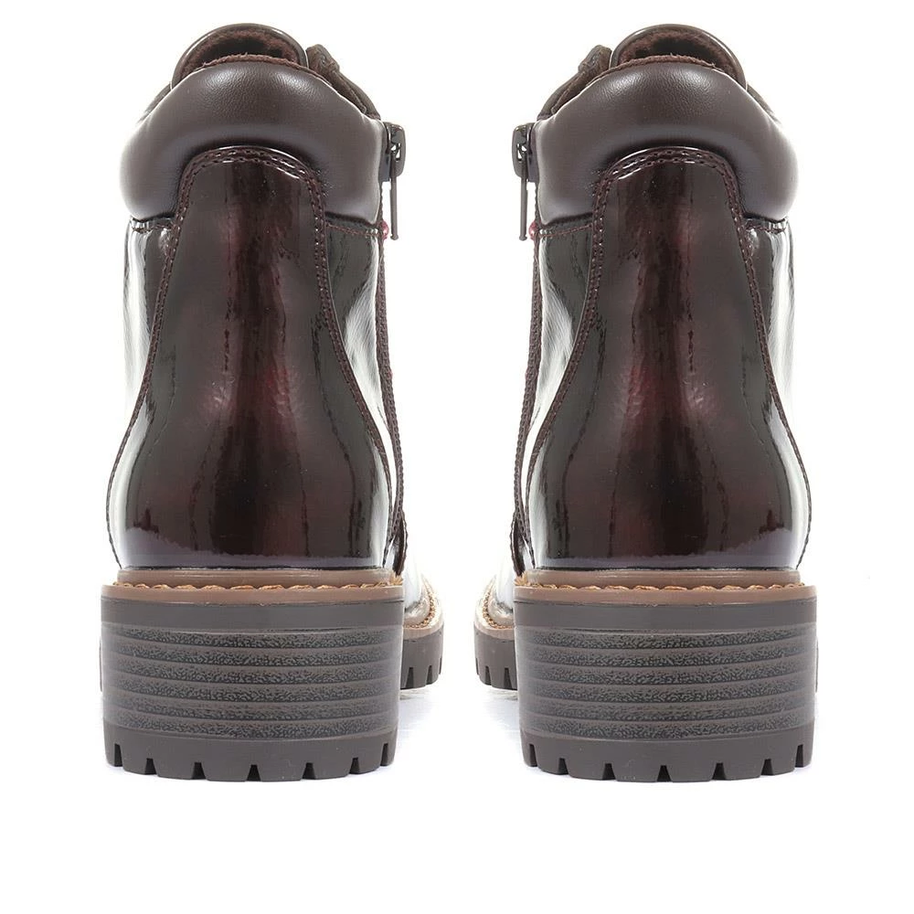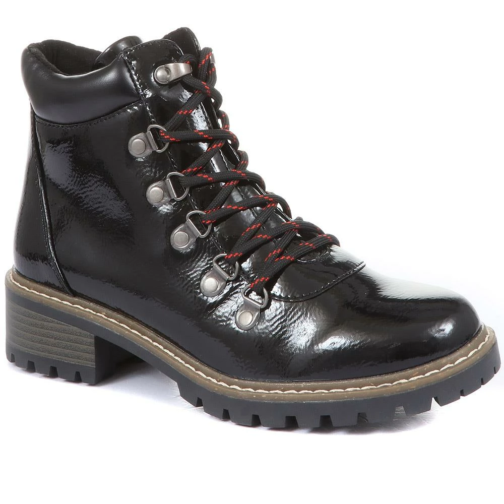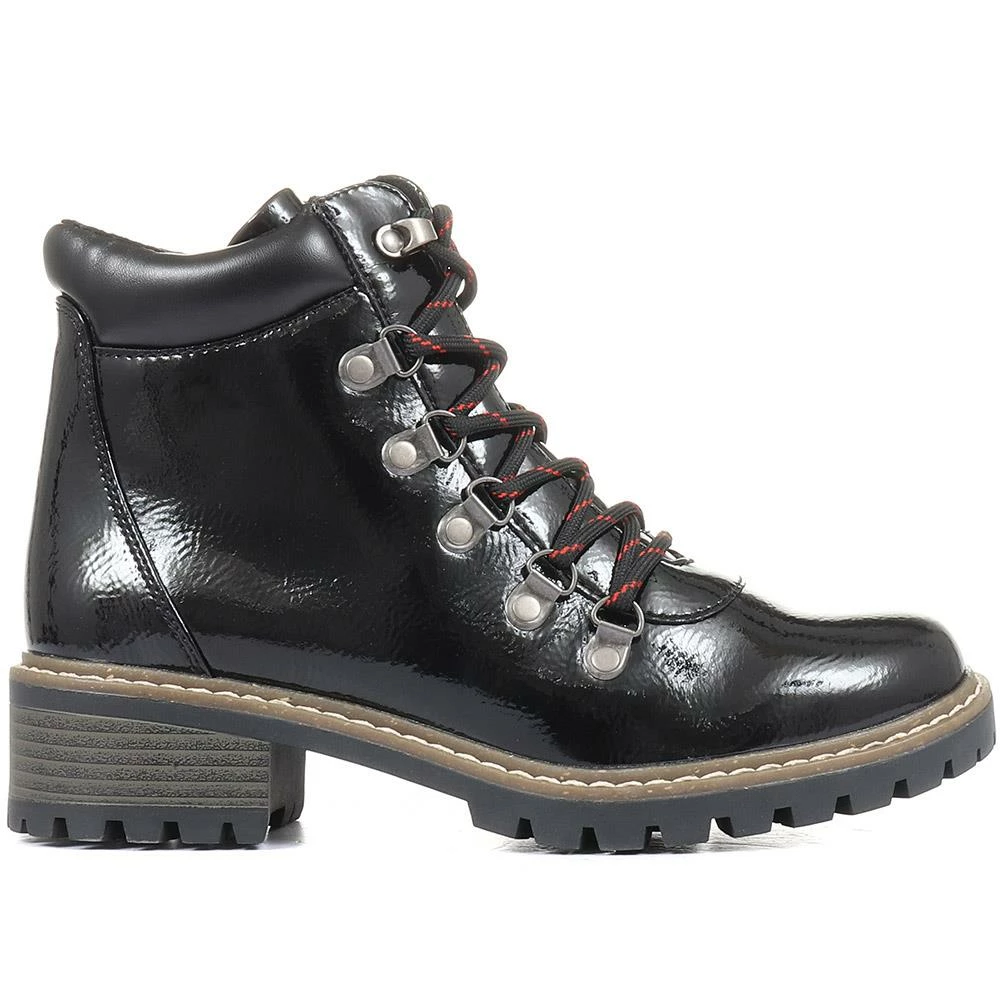 An unstoppable trend for the cooler seasons, and beyond, hiker boots are a must have style in any woman’s wardrobe. Imagined in a high gloss finish, these beautiful ladies’ boots give a glamorous take on a classic style. Styled with a padded ankle cuff, the boots sit upon a low block heel for a comfortable boost of height.
