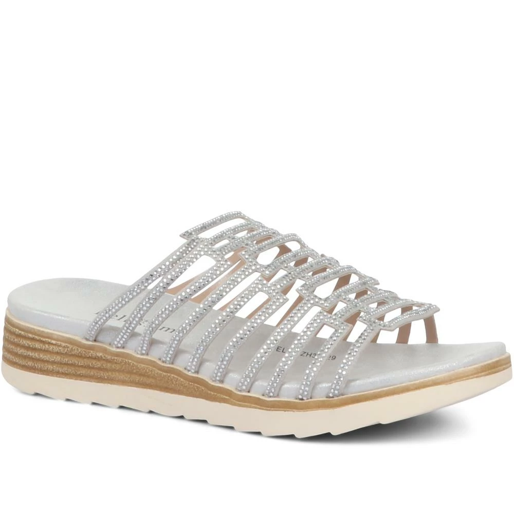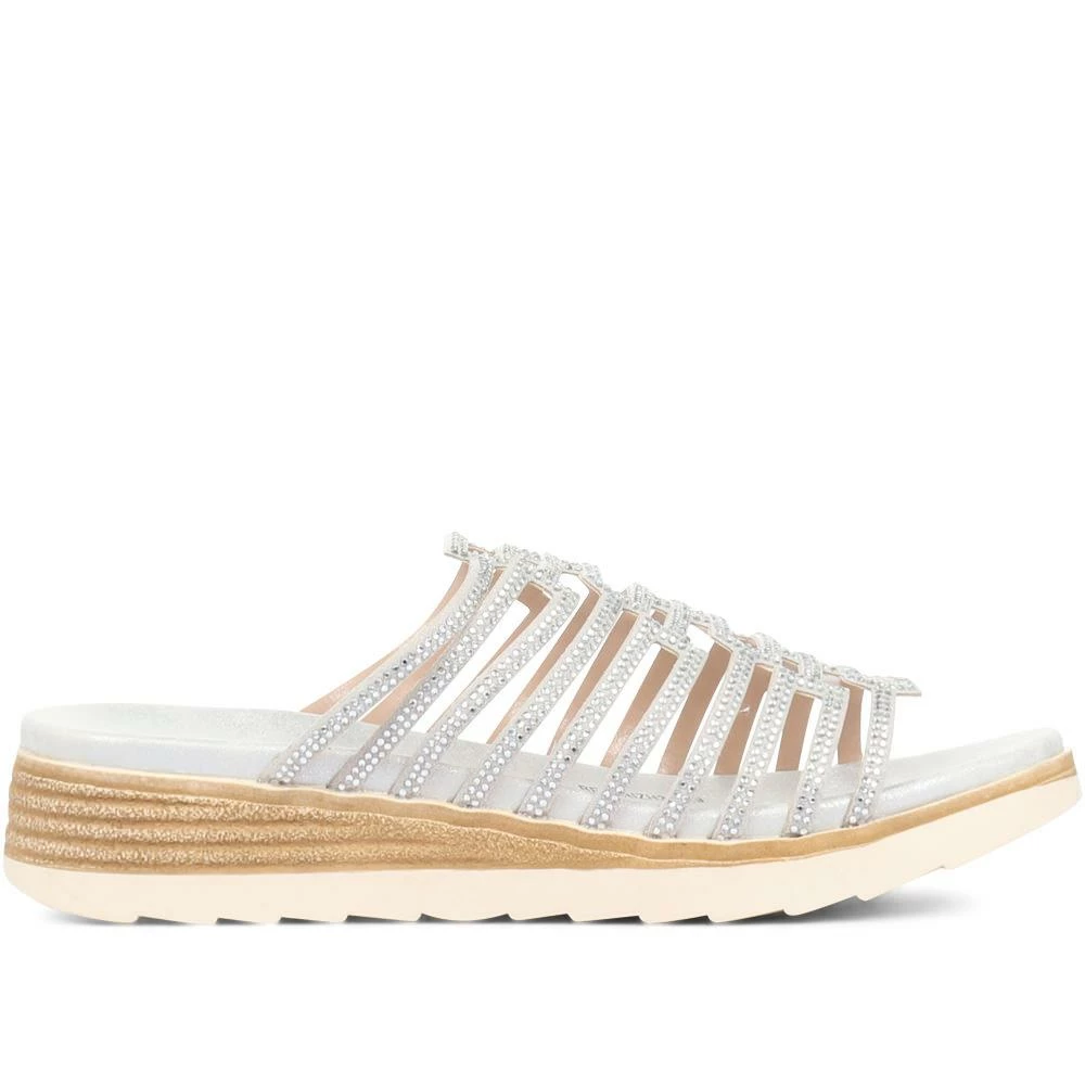 What better addition is there to a summer wardrobe than a trusty pair of mule sandals? Made with a flexible flatform sole, these sandals are so easy to slip on as you head for your holidays or to find a little sunshine, the cushioned insole ensures lasting comfort and the embellished lattice upper is decorated with intricate diamante detailing for the all-important style factor.