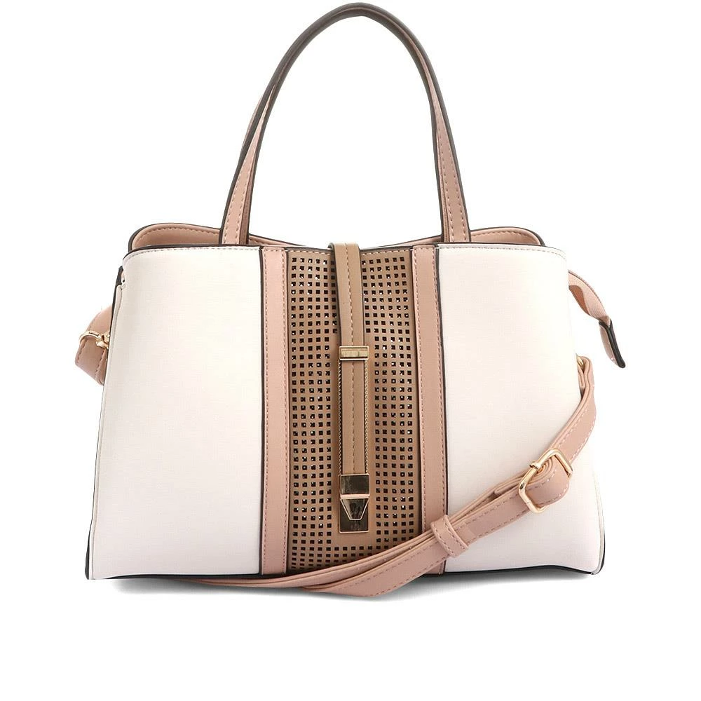 A chic choice for days out and about, this ladies? handbag is imaged in sumptuous tonal shades. Imaged in a symmetrical panelled design, the centre panel is intricately cut out to create a dimensional pattern. Crafted with a duo of a shoulder handle and adjustable long strap for cross-body wear, the tote bag offers multi-wear appeal and classic style. Perfect for taking you from day to evening, the bag has a roomy interior and extra interior pockets, and is secured with a zip closure for safe keeping.