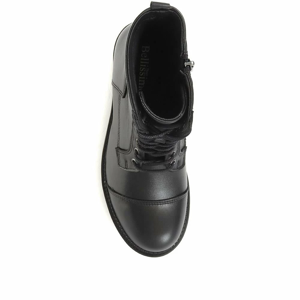 Bring bold style to your everyday looks with these chunky lace-up boots by Bellissimo. Made with luxury leather, these ankle boots boast a chunky block heel that will add an instant boost to your height while still keeping you comfortable. Complete with super soft linings, a cushioned footbed and a handy side zip fastening.