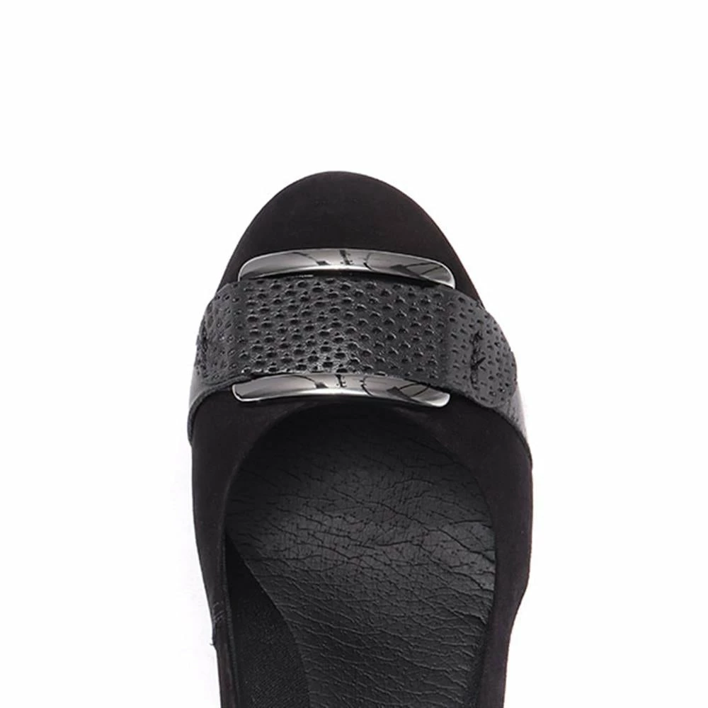 Adding a touch of height to your day to evening looks, the nubuck shoe sits on a mid wedge heel. Padded linings and a cushioned footbed ensures maximum comfort for your smart days ahead, embellished with leather trims and metallic buckle finish at the toe, the Brazillian made wedge heel is completed with gripped sole support.