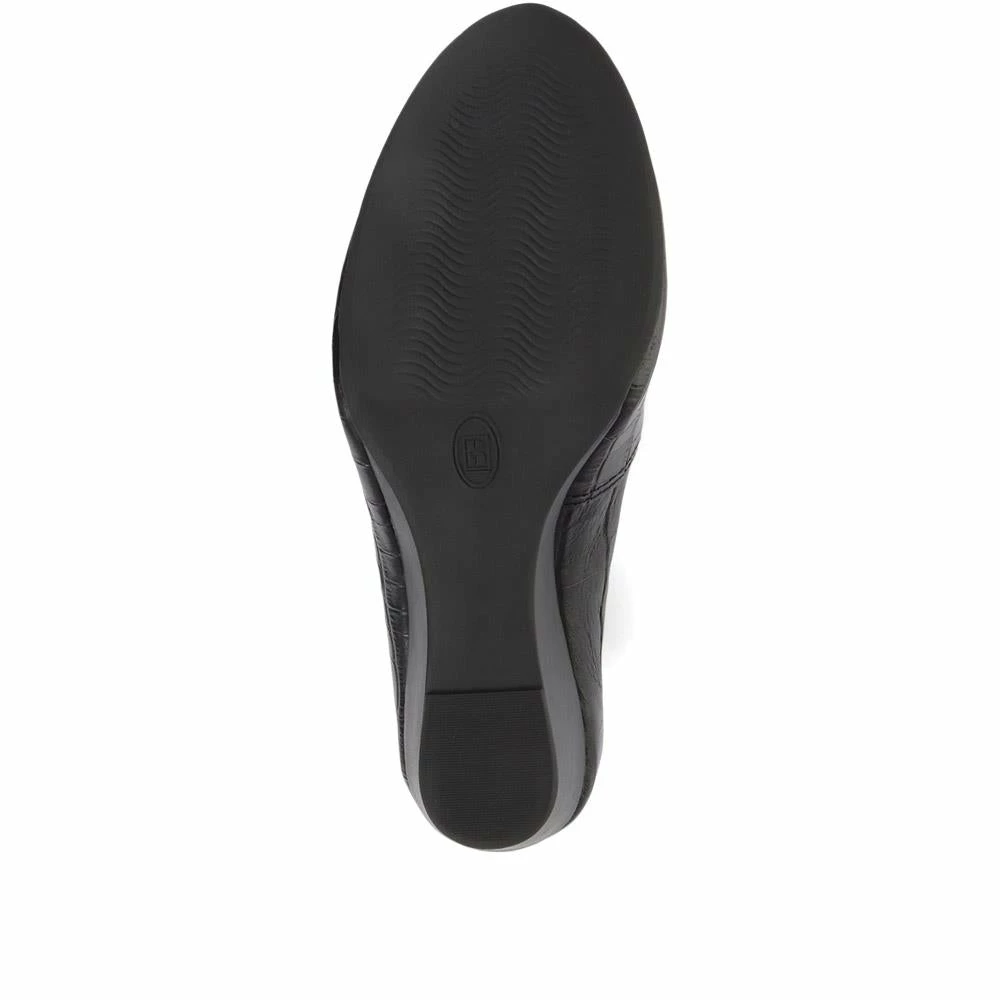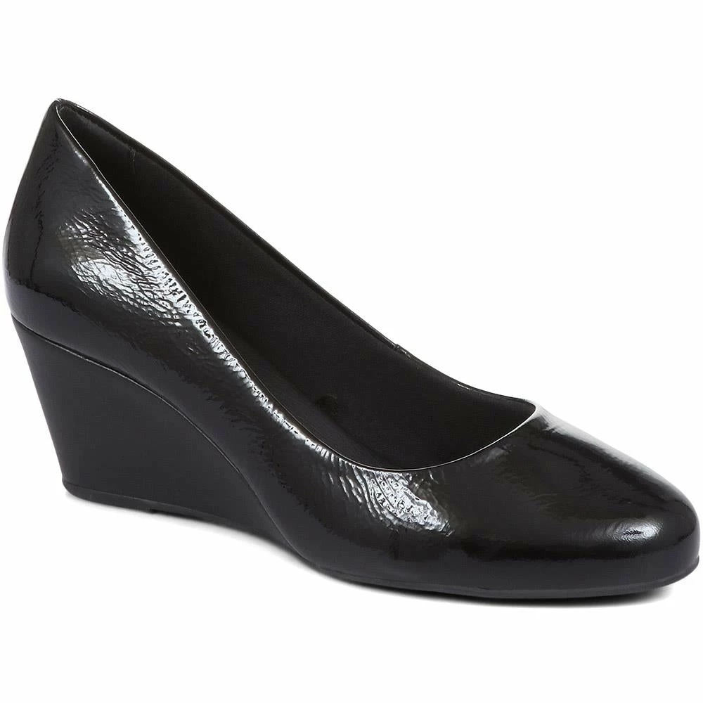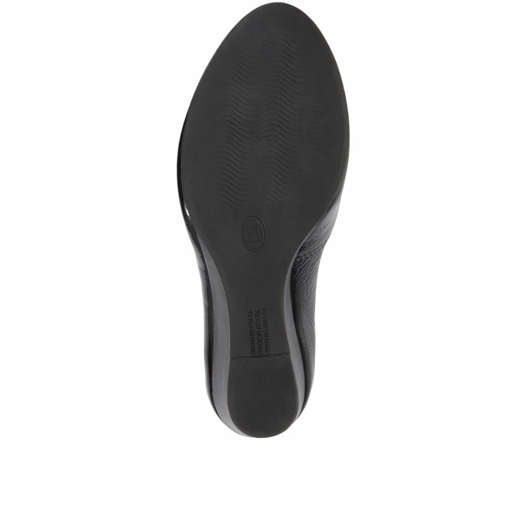 Elegant and classic, these ladies’ pumps offer endless styling opportunities in a wide range of settings. Whether as the perfect finishing touch for a special look, or to pair with smart trousers for a workwear outfit, the pumps are poised upon a wedge heel for a comfortable boost of height. Crafted from quality leathers, the pumps are polished for a high shine finish, adding a touch of glamour.