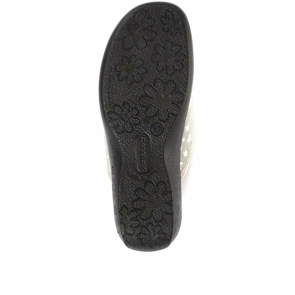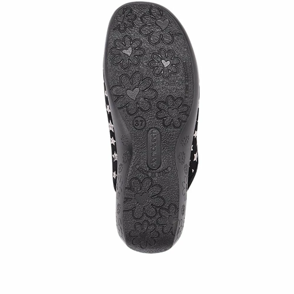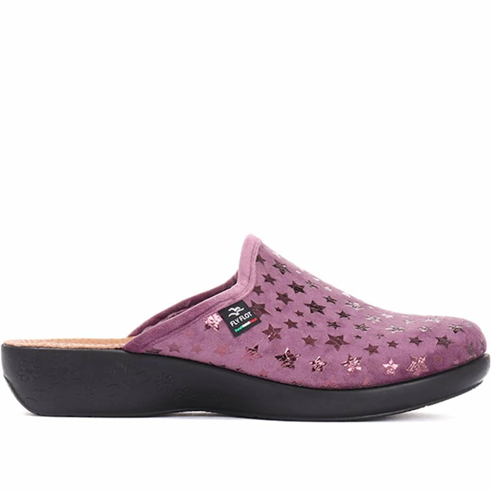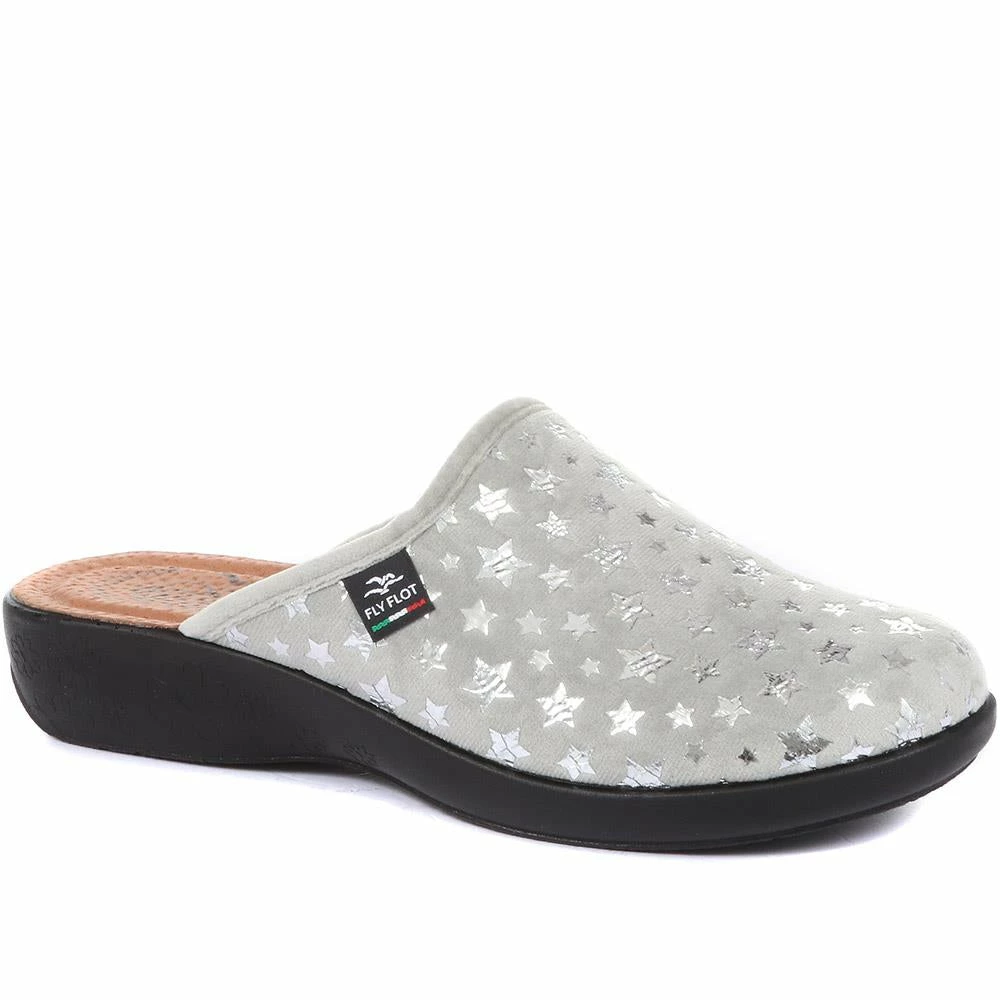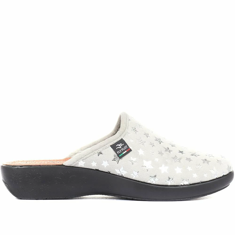 The shining star of comfort, Fly Flot’s slipper mule is made in Italy with amazing anatomic features including a self-moulding leather footbed and anti-shock technology. Styled with a super soft upper emblazoned with a metallic star print and lined with cushioned support, created with a simple slip-on design for super easy wear.