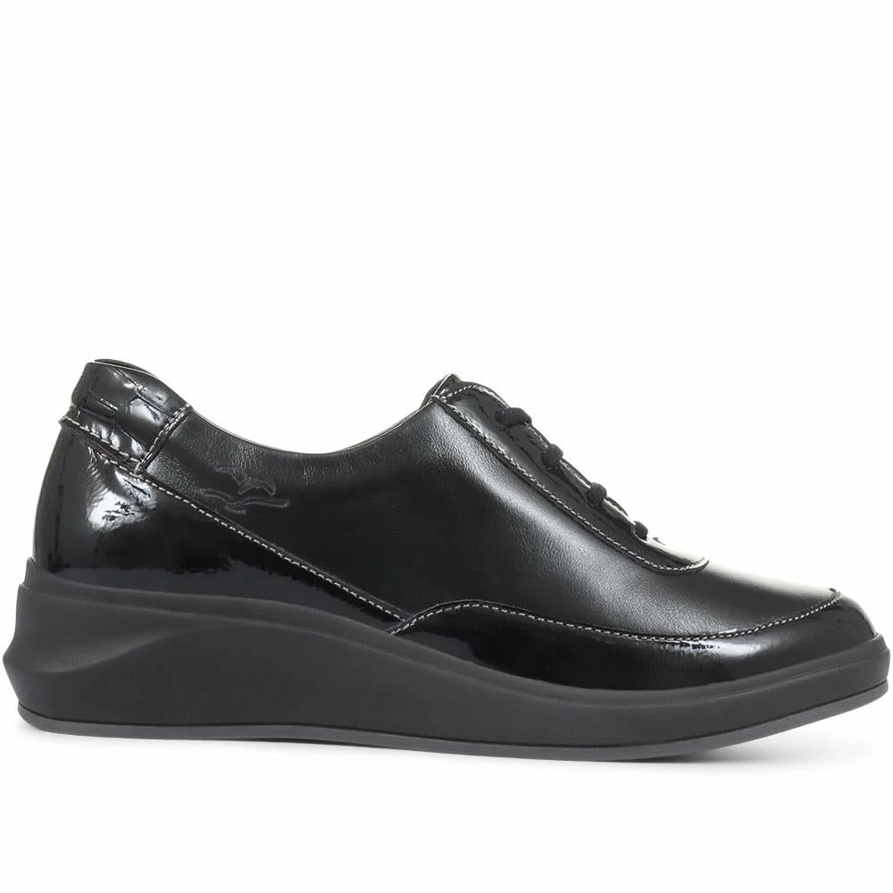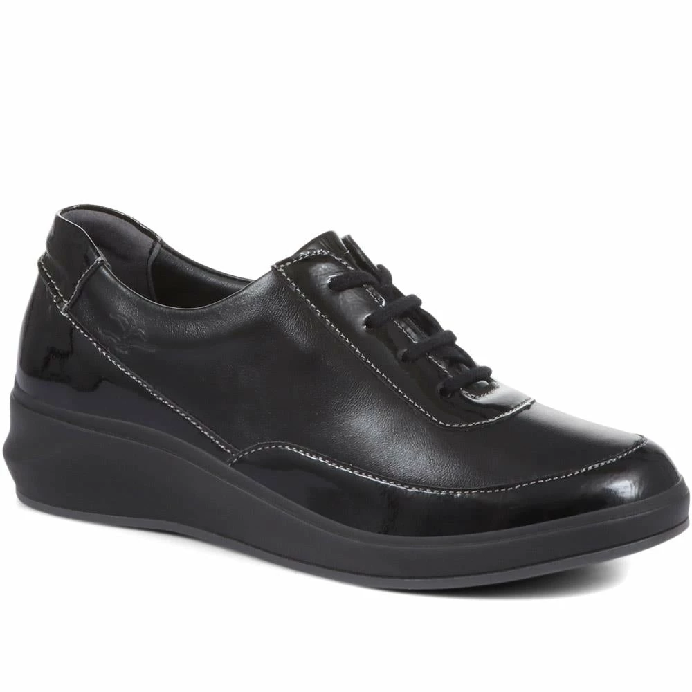 Inspired by classic and sophisticated style, these ladies lace-up shoes are crafted with Fly Flot’s best-selling comfort technology, from the anti-shock soles to the self-moulding leather insole, these shoes will provide long-lasting support that will step you through your day with revitalising comfort. Built with smooth leathers and decorated with glossy patent leather accents, they are the perfect shoes for smarter occasions like work. Complete with a low wedge heel that will add a comfortable boost to your height.