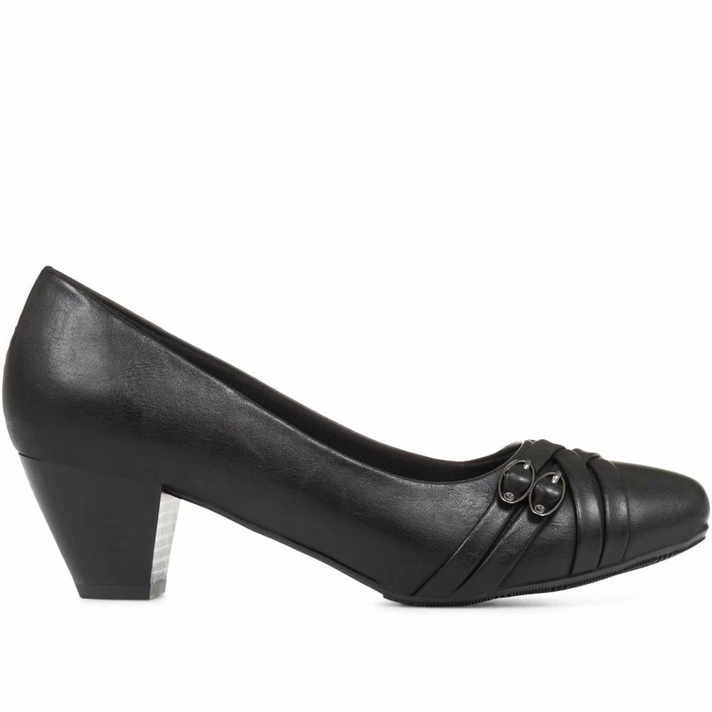 Timeless in style our heeled court shoe makes a must-have staple for your smart and formal wardrobes, adorned with a faux buckle cross-over design with a soft square toe for classic styling. Sink into the plush cushioned insole and let the smooth padded lining get your feet ready for party ready comfort, complete with a short stacked heel for subtle height.