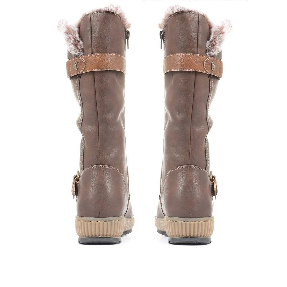 This calf-length cold-weather boot features a shock-absorbing dual density sole and tread design which provides sturdy grip with every step. Its smooth upper is decorated with neat stitching and dual buckle detail. A faux-fur cuff, soft inner lining, and full length inside zip complete this comfortable winter warmer.