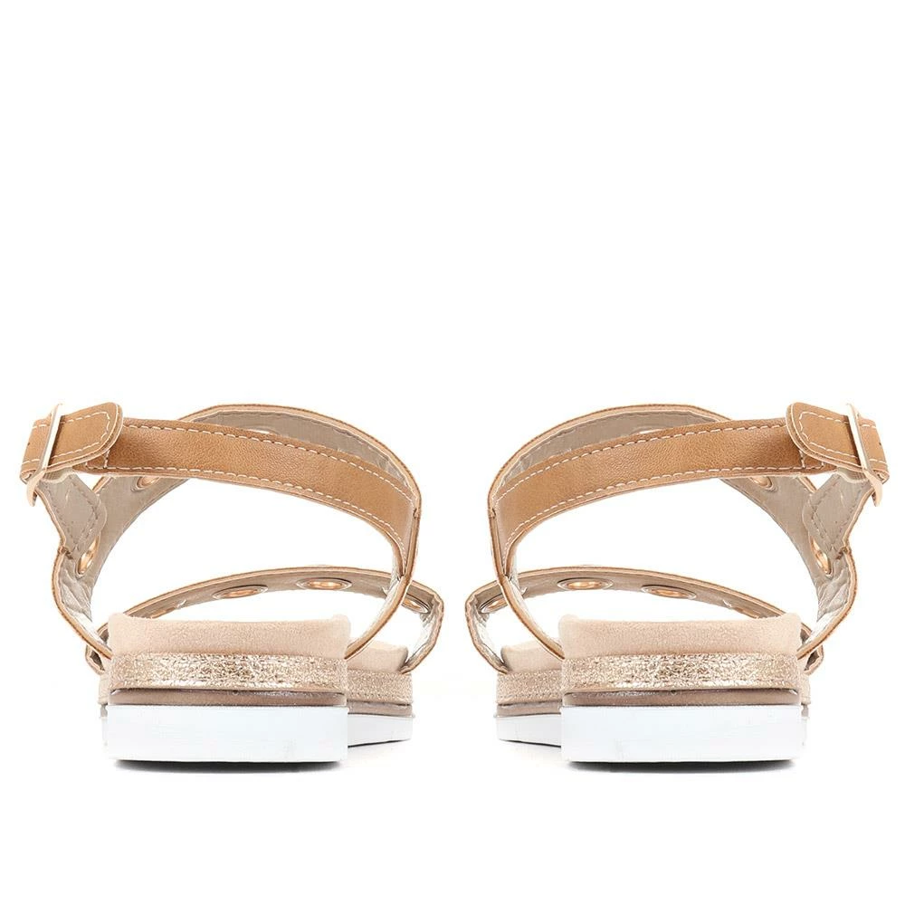 Ideal for far-flung holidays and sunny adventures closer to home, these platform sandals will elevate your summer stylings. Situated on a shock-absorbing cork-effect platform sole, with gripped tread and comfortable cushioned insole for added support. The upper straps are embellished with shining eyelet details and secured thanks to a buckle on the slingback ankle strap.