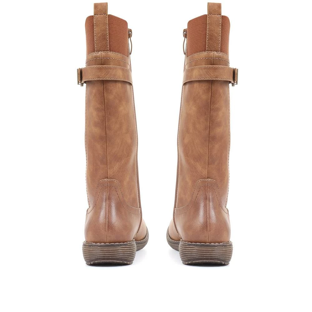 An elegant and simple choice for casual days, these ladies’ calf boots will offer endless styling opportunities. Imagined in a rider inspired silhouette, the boots feature a panel of elastic giving aided flexibility and a comfortable fit. Decorated only by a single strap and metallic toned buckle, the boots are secured with an inside zip for effortless wear.