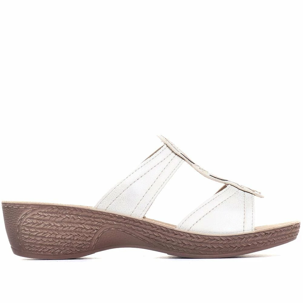 Lightweight mule sandals are a must-have for the sunny months. This pair features a dual strap design, with an embellished connecting strap for foot flattering style. Situated on a lightweight and flexible outsole that’s topped by a breathable leather insole for added freshness throughout the day. The slightly raised wedge heel will add a comfortable boost to your summer looks.