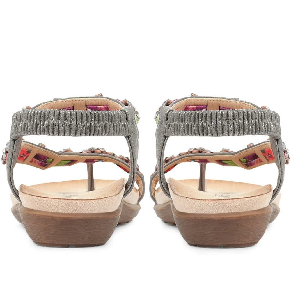 A stunning summer sandal, perfect for adding a touch of glamour to your suitcase style. The metallic straps are opulently detailed with floral decoration elegantly framing the foot with a spiralling silhouette. A deep cushioned footbed ensures exceptional comfort through the day and evenings and safely secured with a stretch fit ankle strap.