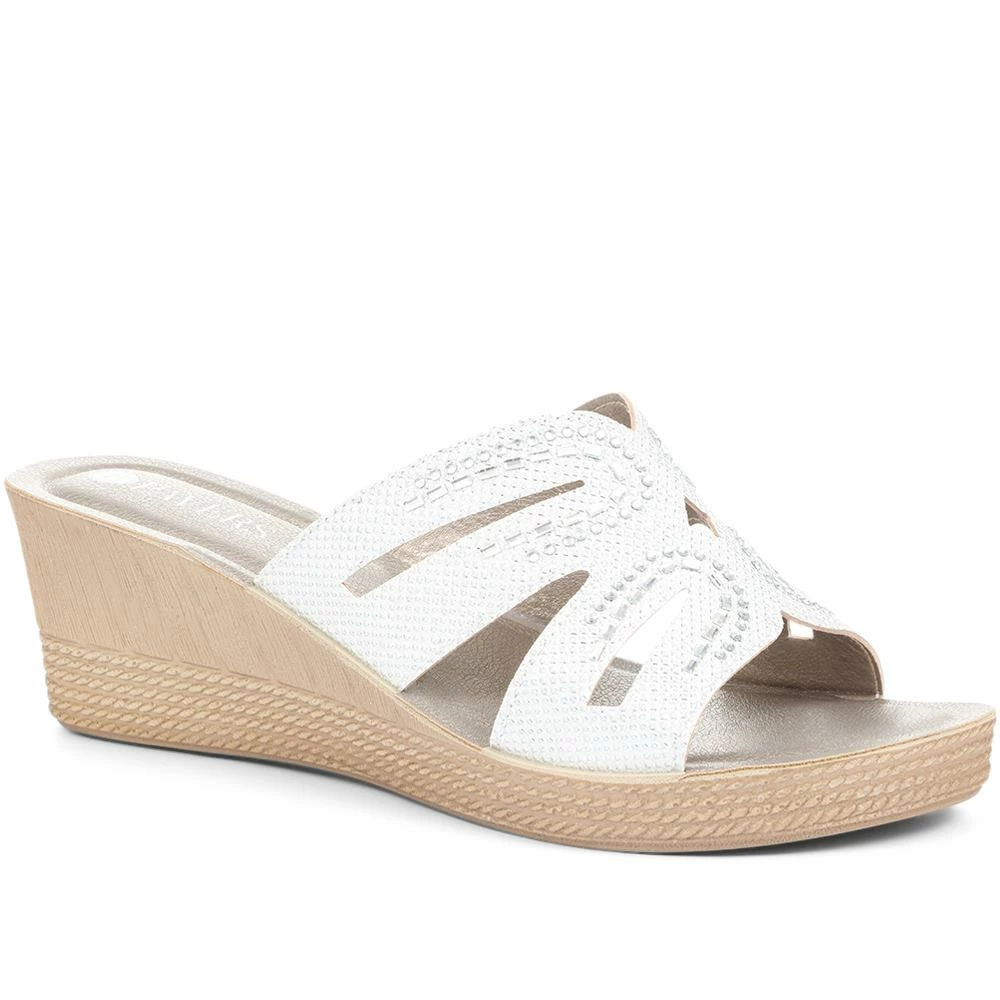 Give your going out looks a little lift by slipping on these wedge heel mule sandals. Elegantly embellished, these wedge sandals will give a glamorous twinkle to your summer wardrobe, equipped with a cushioned insole and lightweight sole to ensure your comfort.