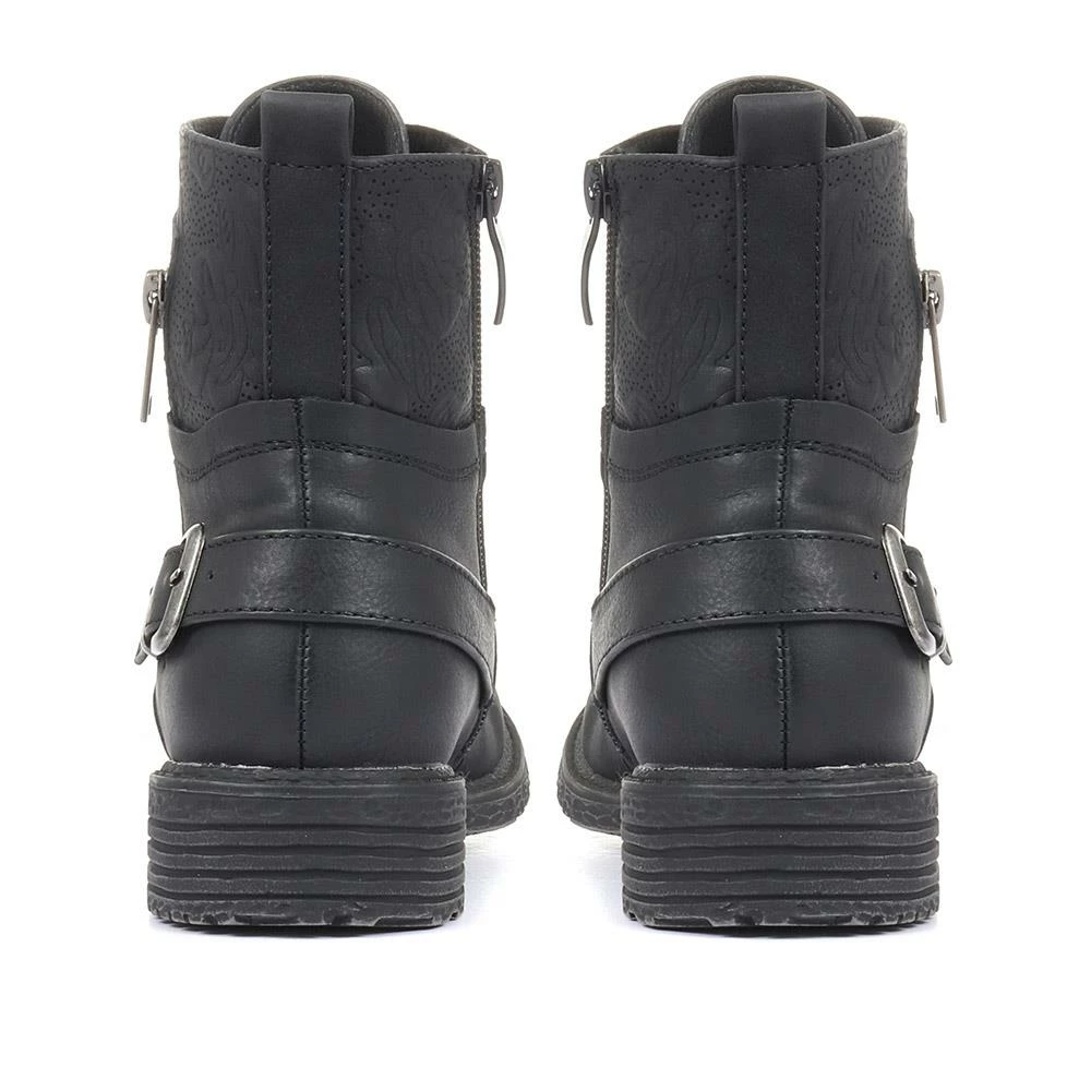 Add a little flourish to your stride, our lace-up ankle boot strikes the balance between rugged styled and pretty detailing. Created with smooth faux leather uppers with engraved floral detailing at the ankle, the short boot is fastened with a classic lace-up front and side zip fastening. Complete with a lightweight, gripped sole and soft faux fur linings.