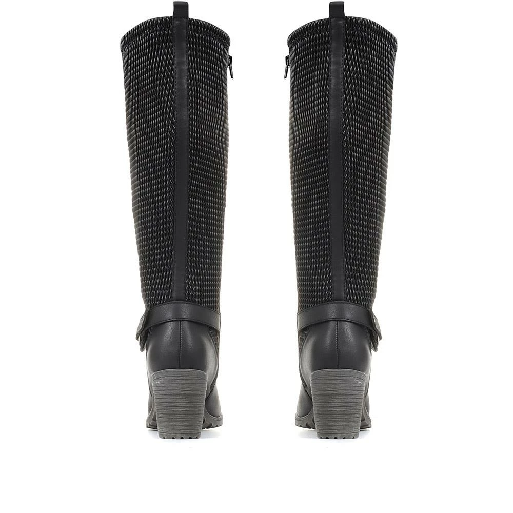 Elegant and tall, these knee high boots give a polished finish to any look. Made with an extra wide calf, the boots feature a soft and stretchy calf panel to give a personalised fit. The long boots feature a low block heel that will lift your looks with lasting comfort and are simply secured with the help of the side zip fastening.