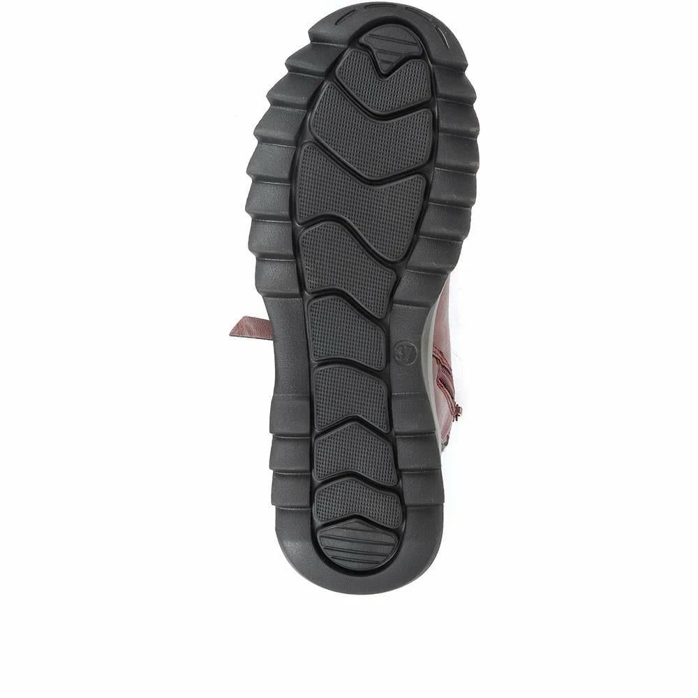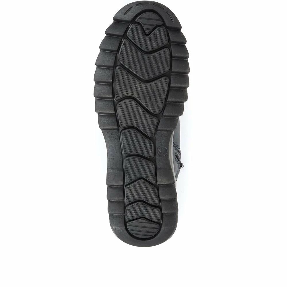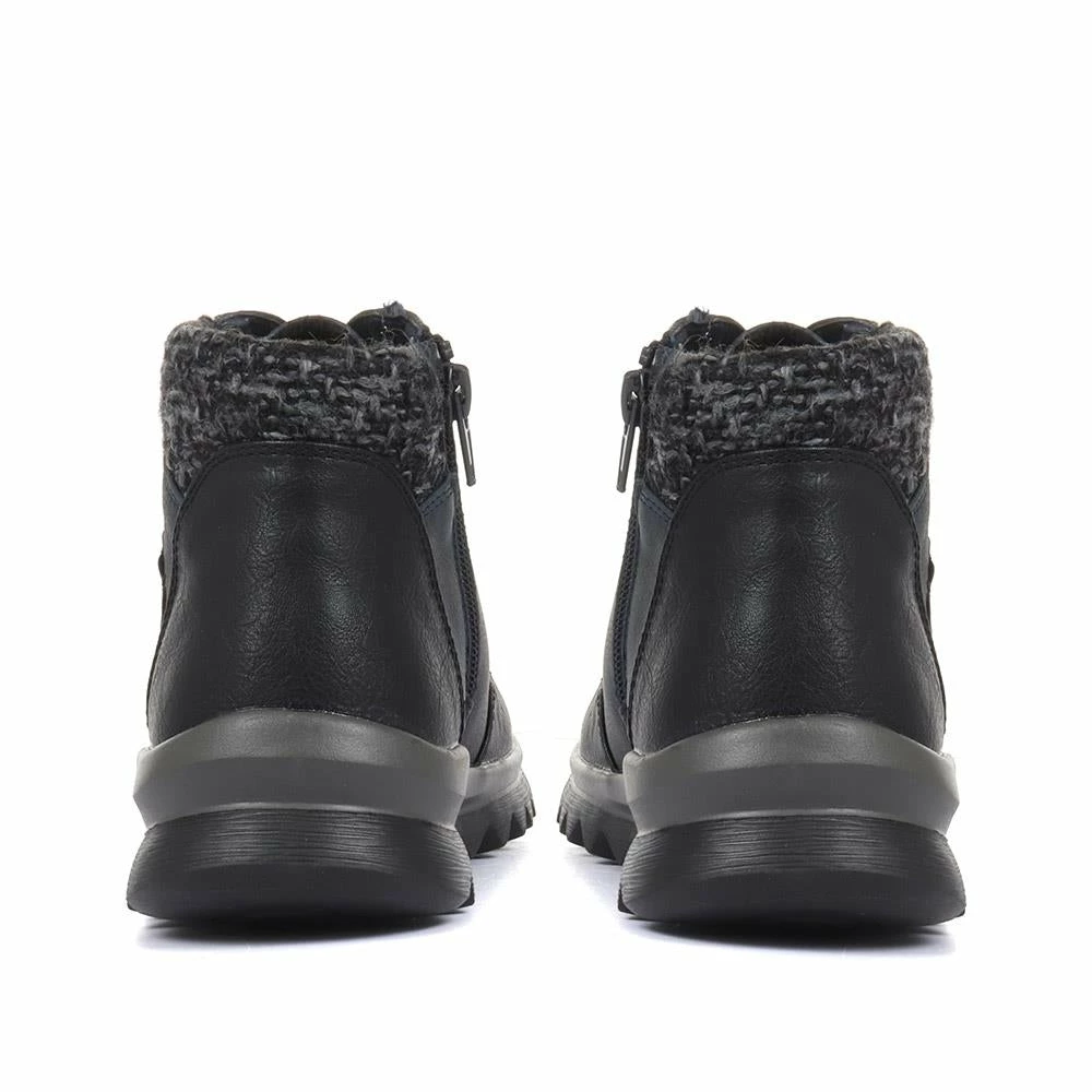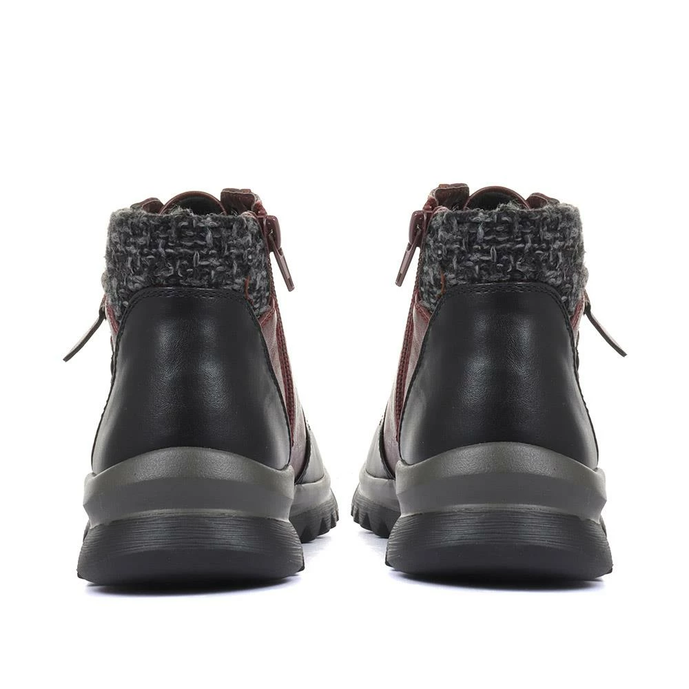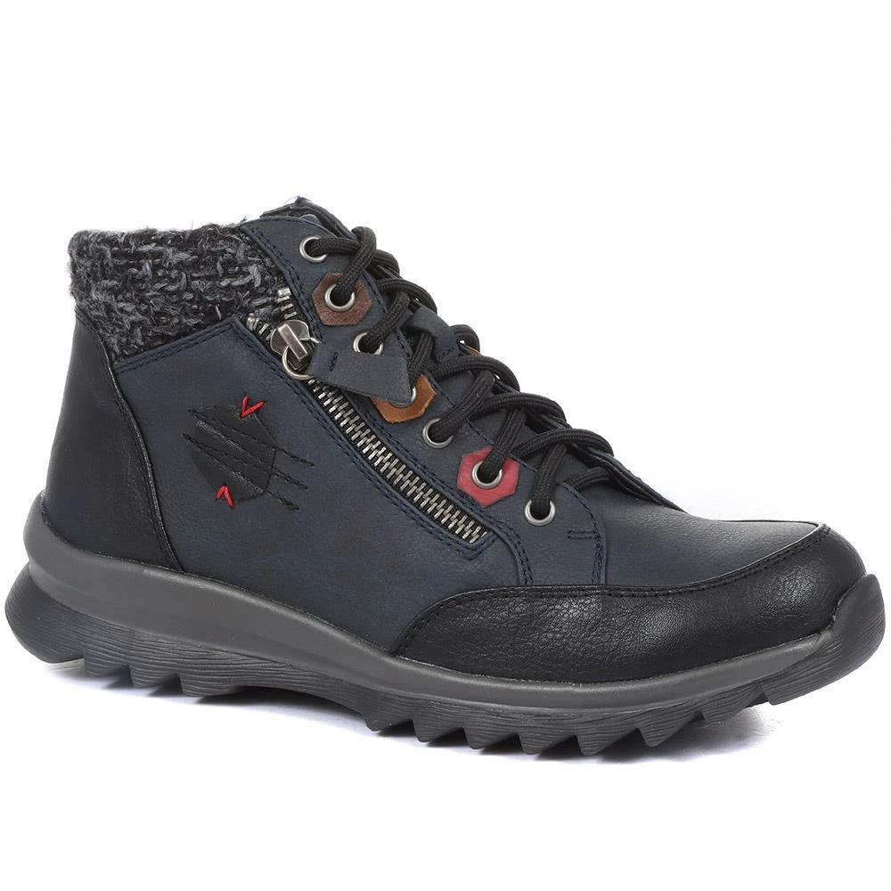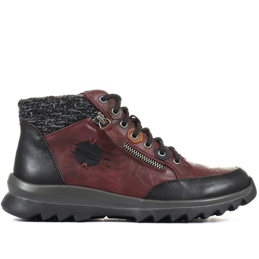 Imagined from tonal panels of faux leather, these ladies’ ankle boots are engineered to take on the day with comfort and style. Designed in a lace-up silhouette, the boots are decorated by a metallic faux zip, and patches of contrasting faux leather. Finished with a knitted ankle cuff for a snug and cosy finish, the boots are secured with an inside zip aiding effortless put on.
