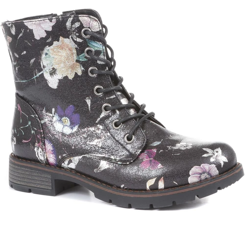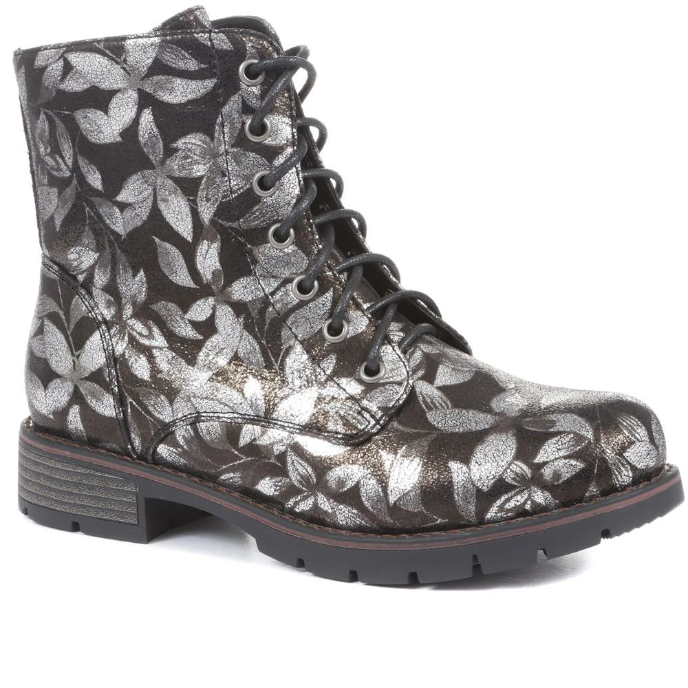 Discover comfort in full bloom this autumn, our tough-talking combat ankle boots are beautifully decorated with a metallic floral print. The lace-up fastenings follow the full length of the boot whilst the side zip allows easy pull-on wear, team with skinny jeans or bright coloured tights for a show-stopping look this season.