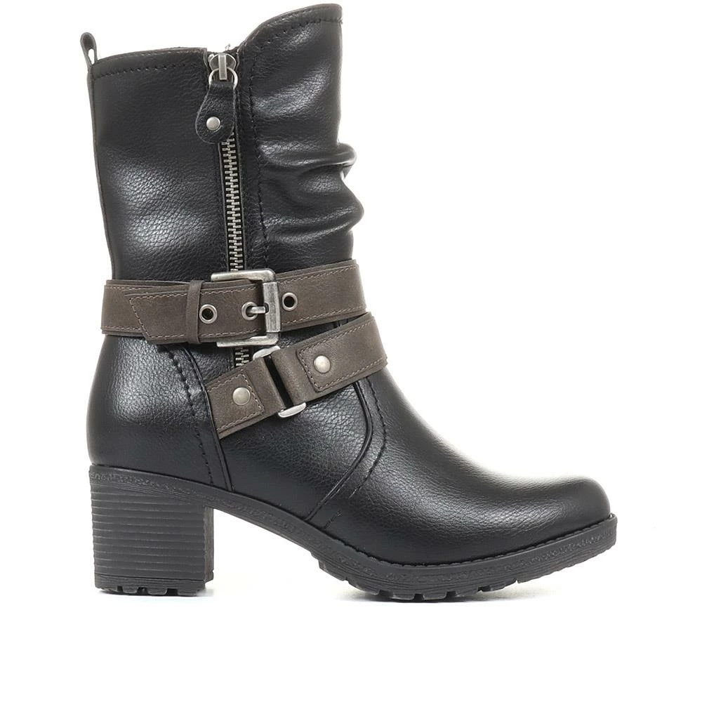 Offering endless styling opportunities for both day and evening, these ladies’ ankle boots are imagined in a subtly slouched silhouette. Poised upon a stacked block heel, the boots are decorated with a faux zip and a buckled ankle strap. Secured with an inside zip for easy put on, the boots are lined with cosy textile for a snug fit.