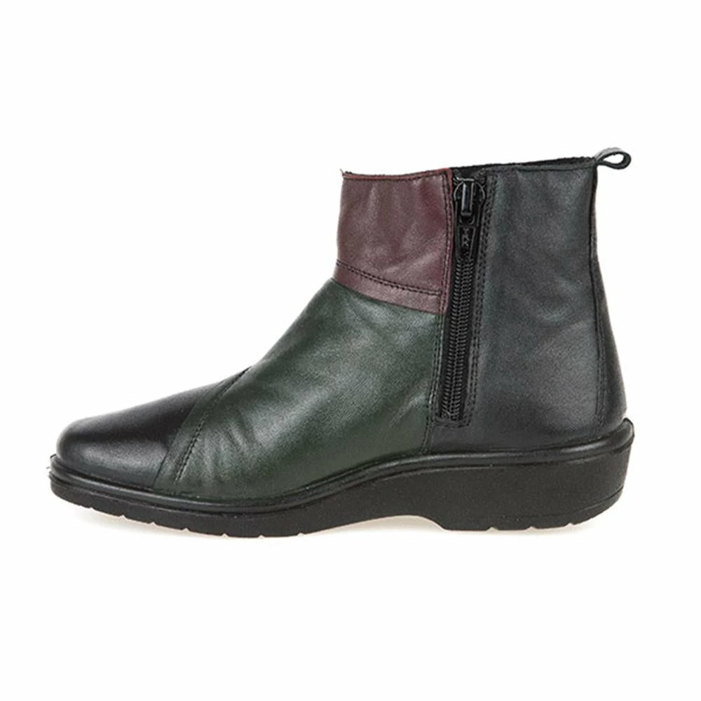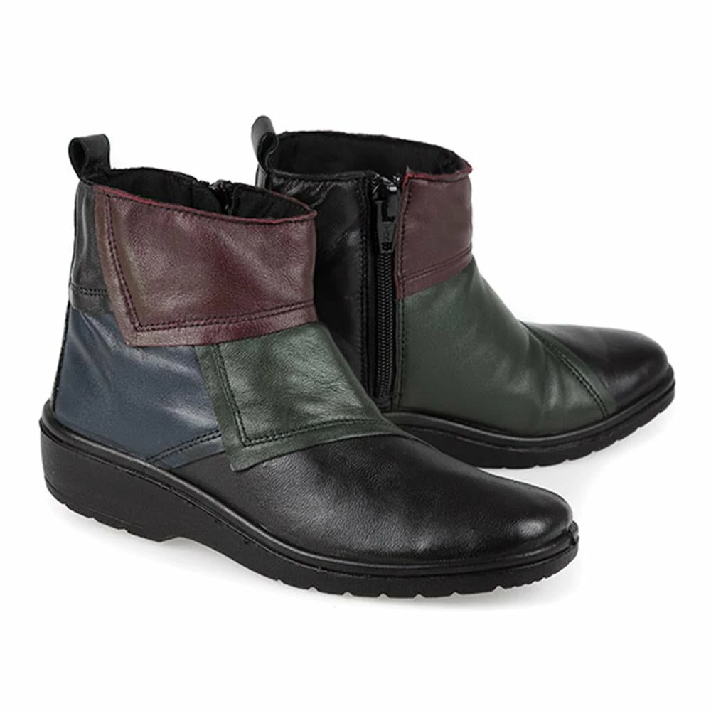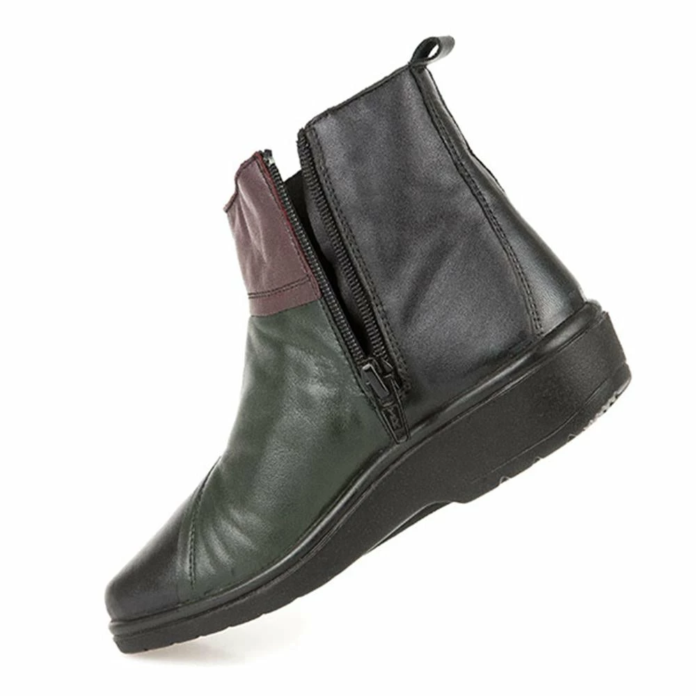 In two-tone shades of burgundy and a deep forest green with a black toe and heel these leather boots with a low wedge are a comfortable, casual choice.