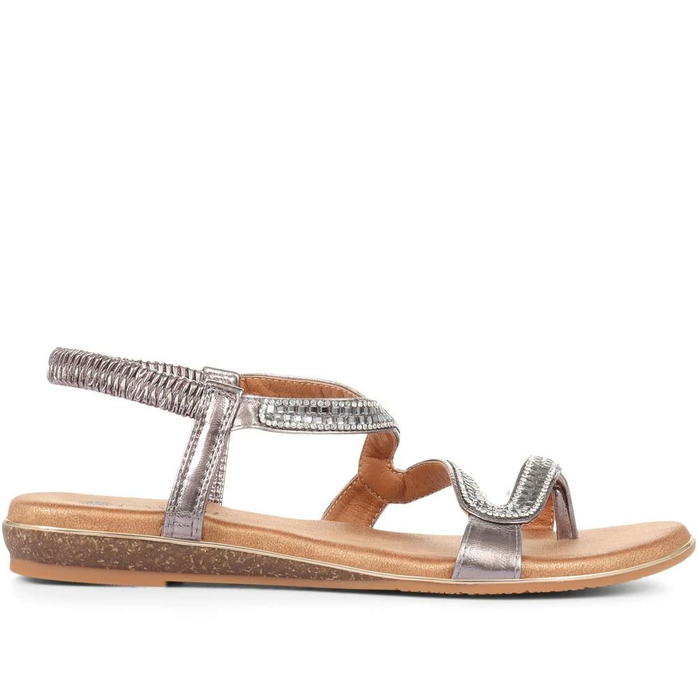 Glamorous summer style that’s comfortable too! These slip-on sandals are made with a strappy design that surrounds your foot for a supportive fit, jewelled and embellished with intricate rows of diamantes. The sandals are finished with a stretchy, elasticated strap across the heel, these sandals have no fussy fastenings for easy slip on wear, finished with a cushioned insole and super flexible traction sole.