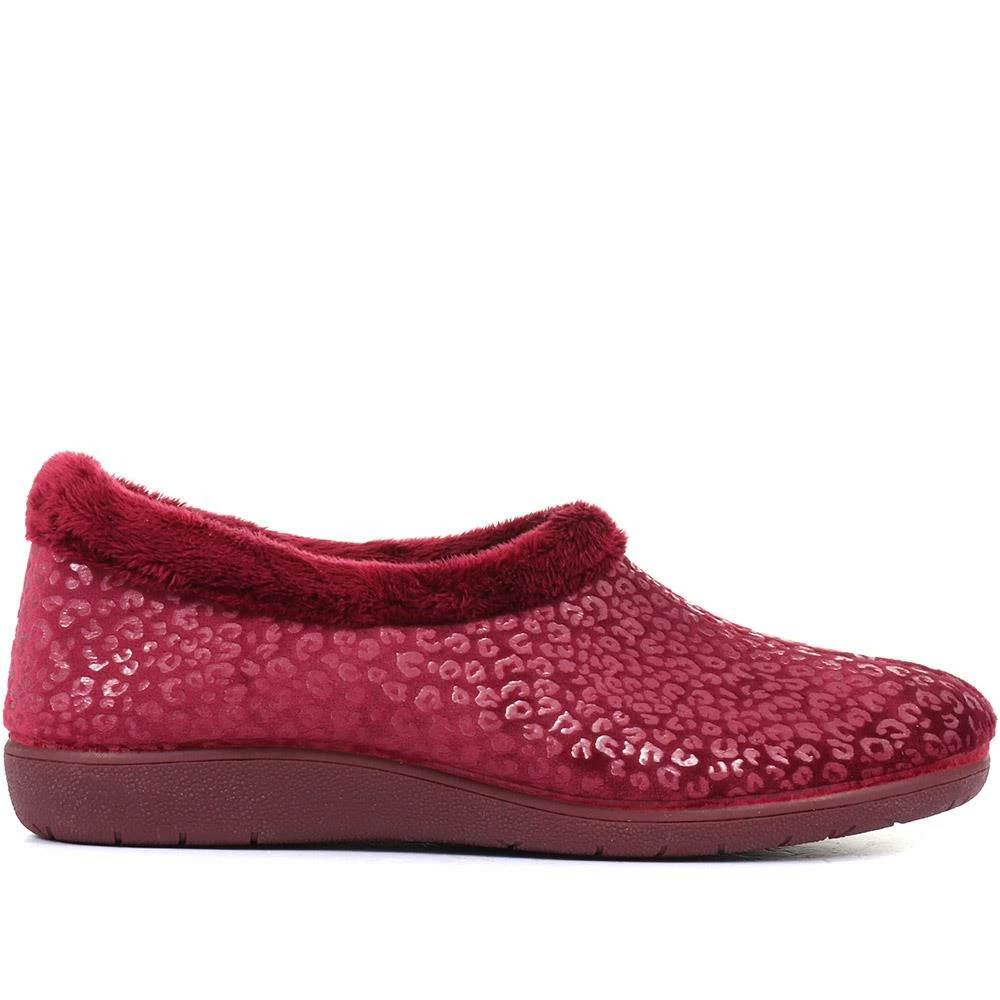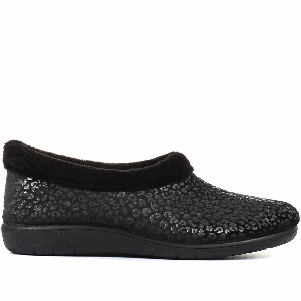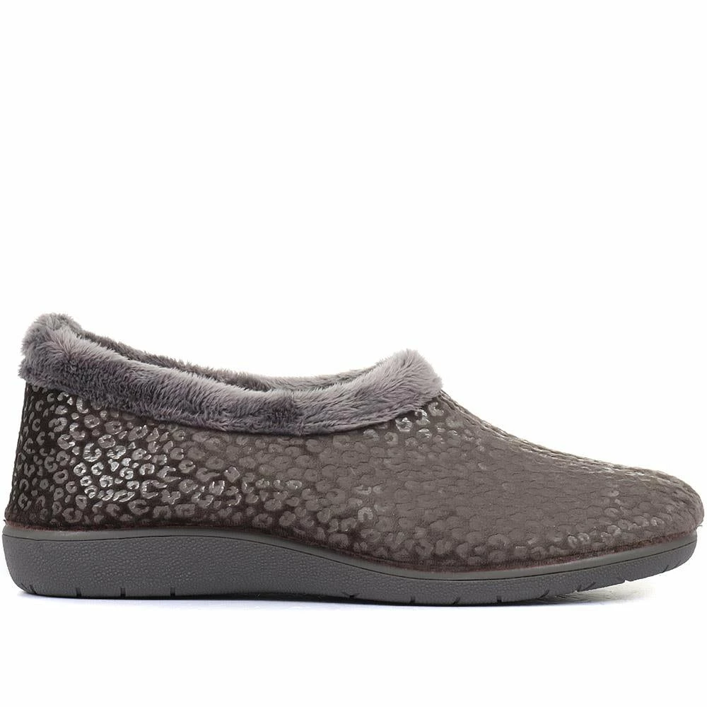 With fluffy trims and cosy linings, these slippers promise endless comfort for the winter months. Made with an easy slip on design, our full slippers are set on a sturdy and gripped sole that will step you effortlessly and confidently through the day. Decorated with intricate leopard print detailing.