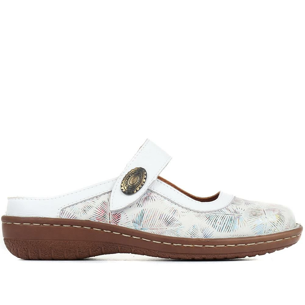 Designed with the very best comfort, our leather slip-on clogs are a must-have style for sunny days. Made with high-quality leather, these clogs are decorated with a pretty floral print and feature an easy slip on design, perfect for ladies who love to potter around the garden or want an effortless everyday option. Complete with a softly cushioned leather insole, with a reinforced heel bed, padded arch support and an adjustable touch-fasten strap.