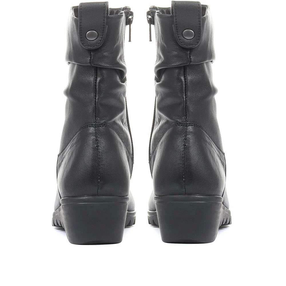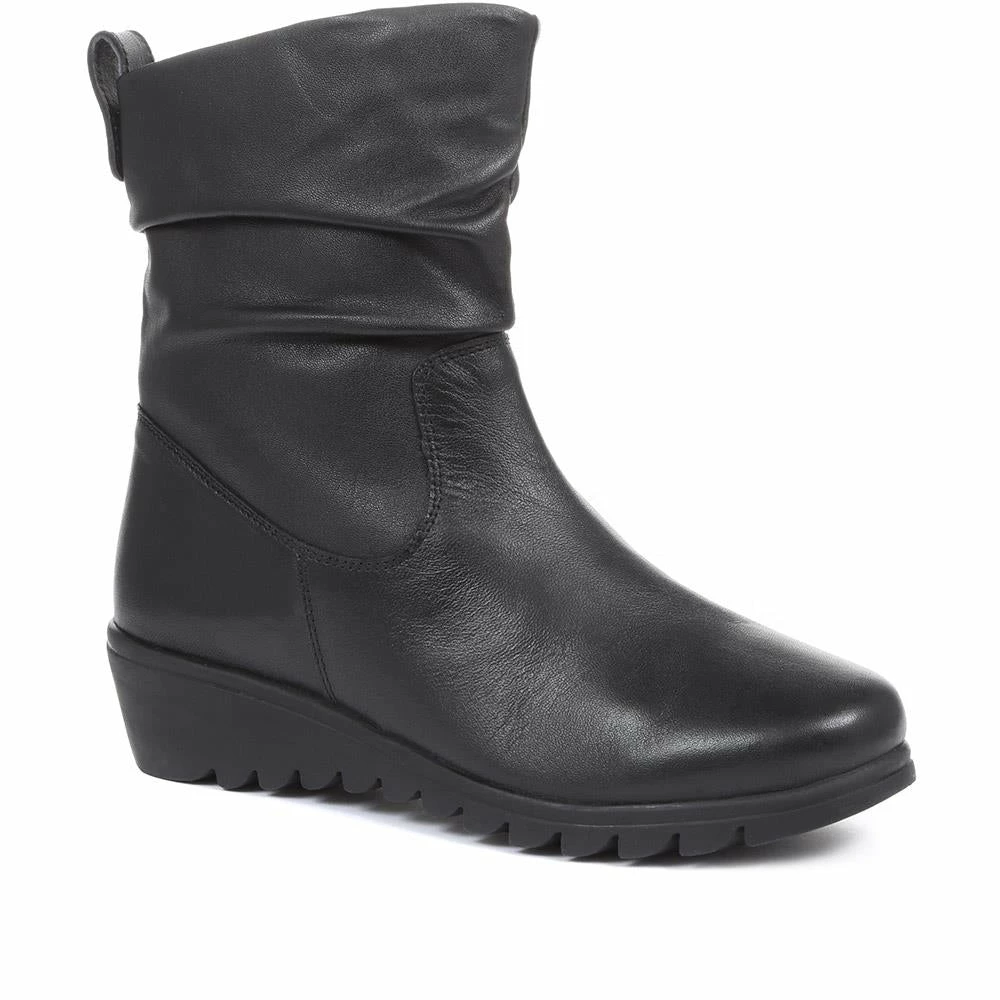 Our casual slouchy leather calf boot will quickly become the essential to your autumnal styling, crafted with luxe nubuck leather and styled with a mid-calf silhouette. Soft faux fur lines the boot insulating against chilly weather, the boot is set on a low wedge heel with ridge effect and features a full length side zip with a cushioned leather insole.