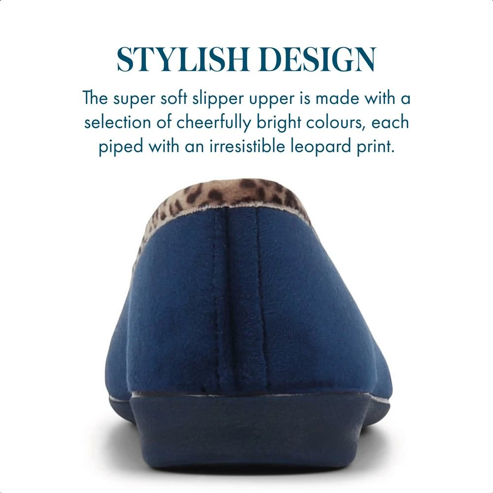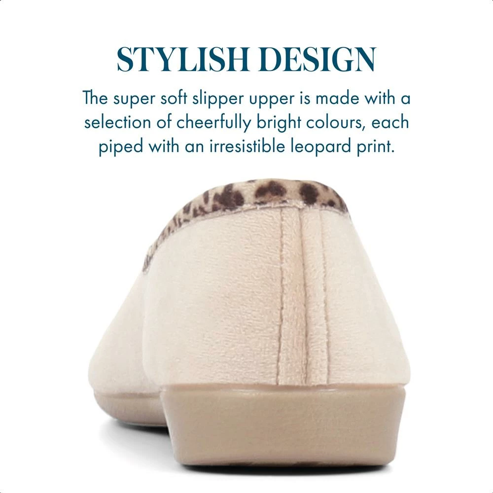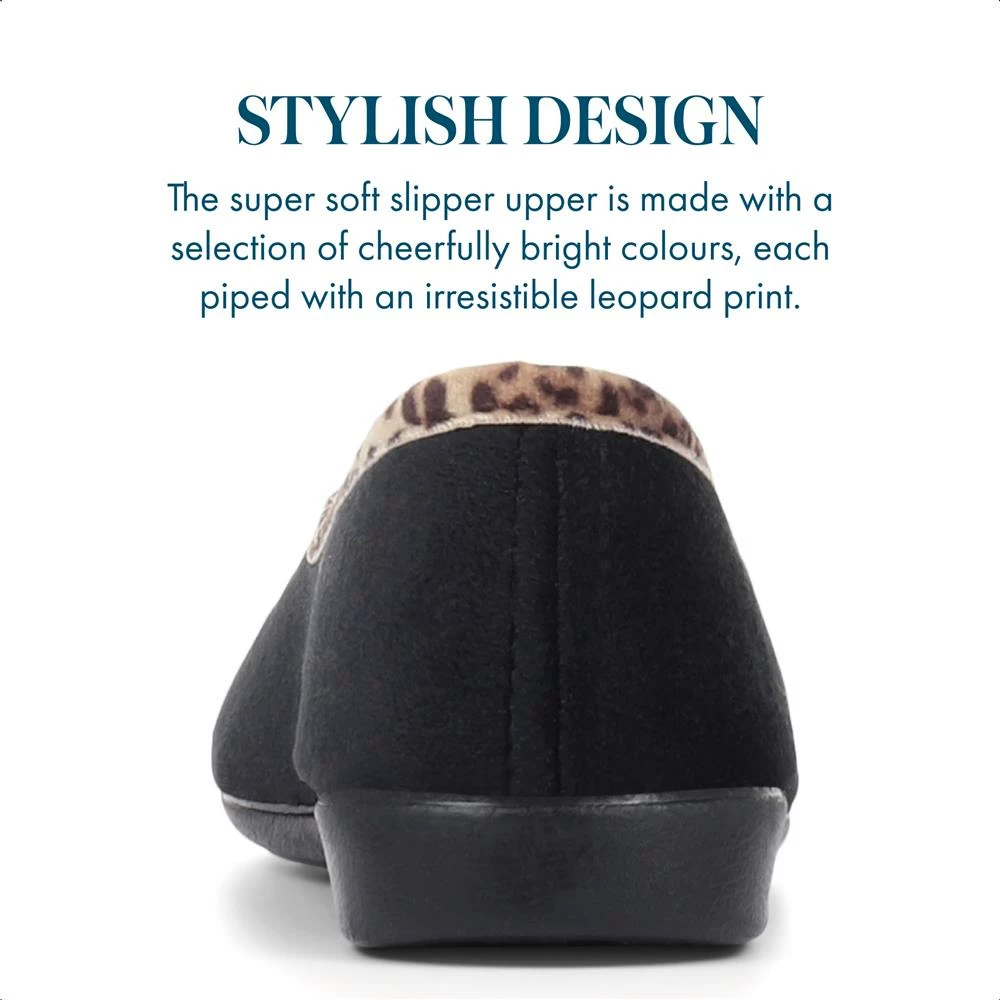 Treating your feet to well needed downtime, our ladies slippers are made with a secure fit and shaped with a v-cut at the toe to allow for easy wear and added flexibility. The super soft slipper upper is made with a selection of cheerfully bright colours, each piped with an irresistible leopard print, complete with a softly cushioned footbed and a gripped sole made with added flex.