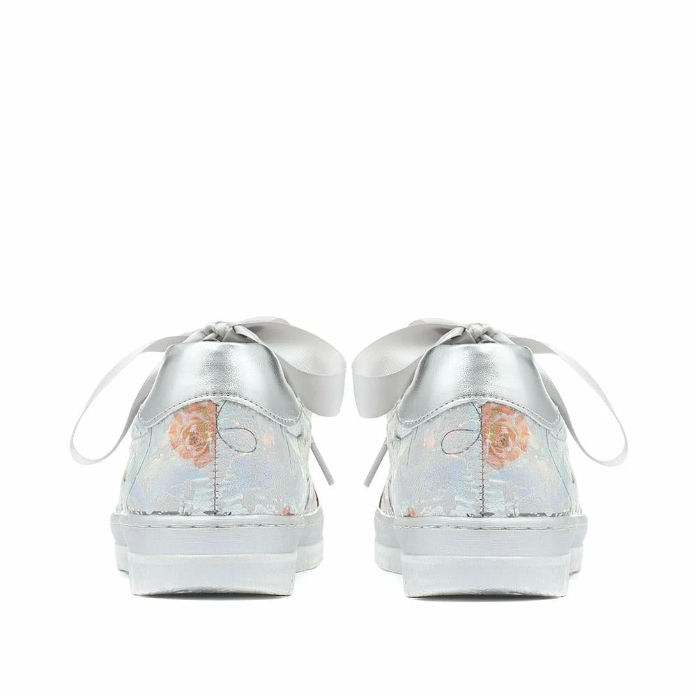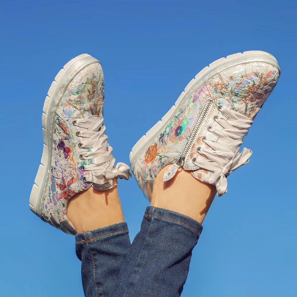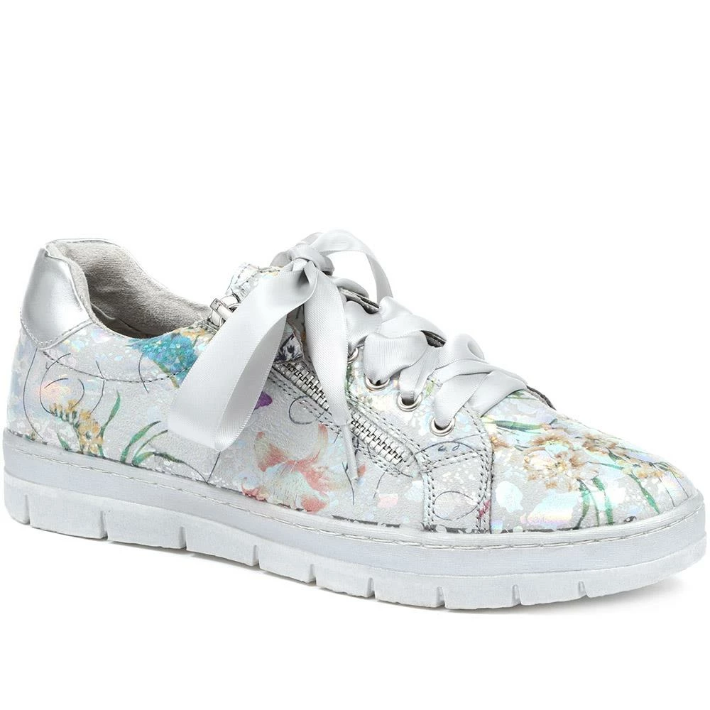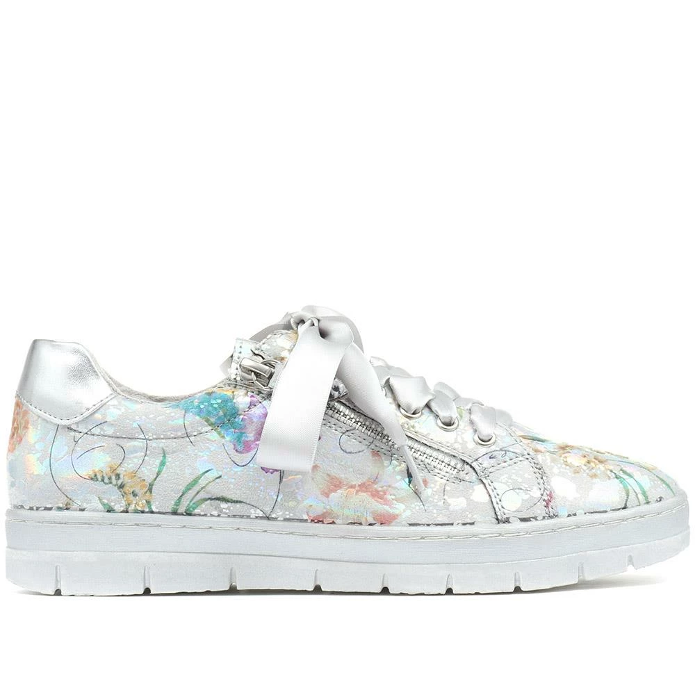 Floral, metallic and fabulous, these flatform lace-up Sneakers will see you through the warmer months, and onwards, with style. The metallic floral print is complemented with a metallic heel counter and faux side zip. A beautifully cushioned insole and feel counter comforts and supports, whilst the shoe is secured with your choice of ribbon or textile lacing, both of which are supplied. These Sneakers are a small fit. If you are between sizes, please order a size bigger than usual.