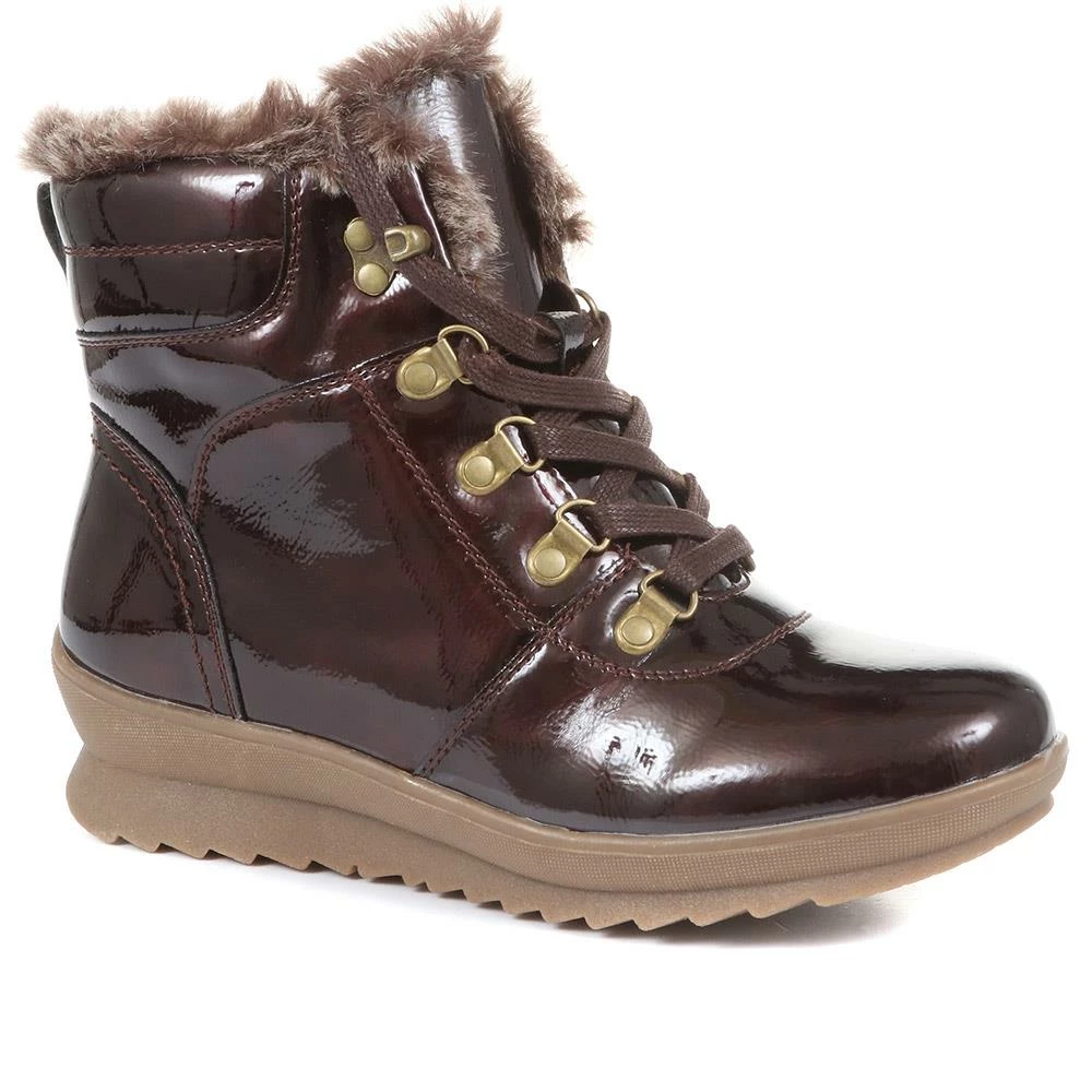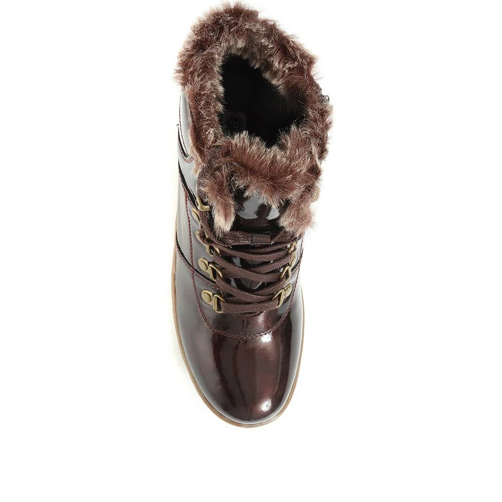 The ideal choice to keep up with the hiker boot trend, this pair has been crafted with glossy patent uppers and feature fluffy faux fur trims and a practical wedge sole. Styled with a classic lace-up fastening, these hiker boots are equipped with an inside zip fastening for easy slip on wear.
