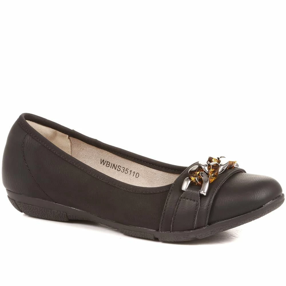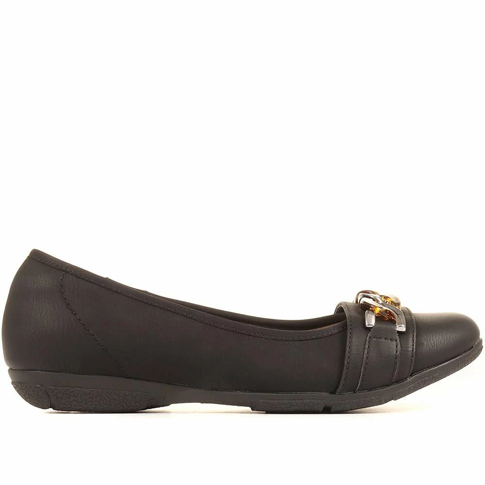 Stepping you through every smart occasion, these slip-on ballet pumps pair perfectly with smart trousers and skirts. Made with form-fitting smooth uppers, the toe is decorated with a chunky chain detail. The soft internals and cushioned footbed will ensure all day comfortable wear, based on a supportive contoured outsole with traction tread for a sure step.