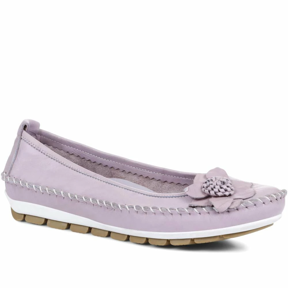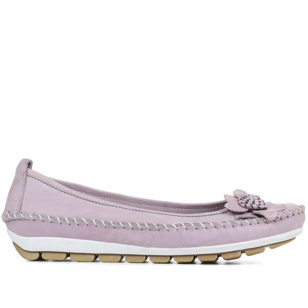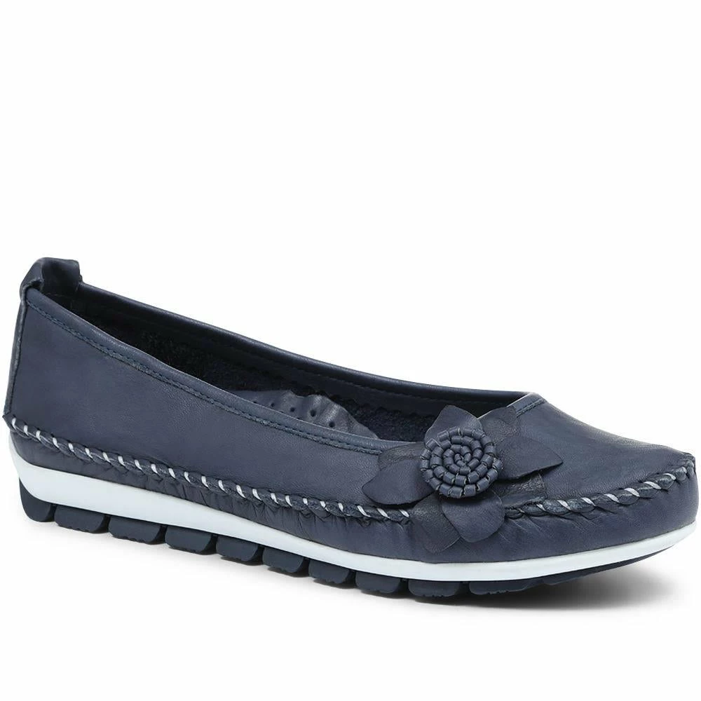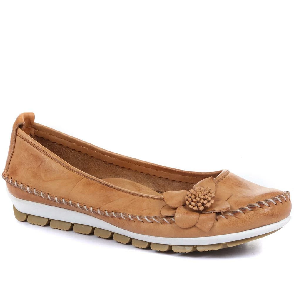 A decorated choice for your casual styling, our leather pump is decorated with an intricate flower embellishment. Crafted with a durable leather upper and lined purely with soft supple leather with a cushioned footbed and arch support, an ideal choice for ladies with a high in-step, the shoe sits on an ultra-flexible rubber sole offering dependable gripped support though your causal occasions.