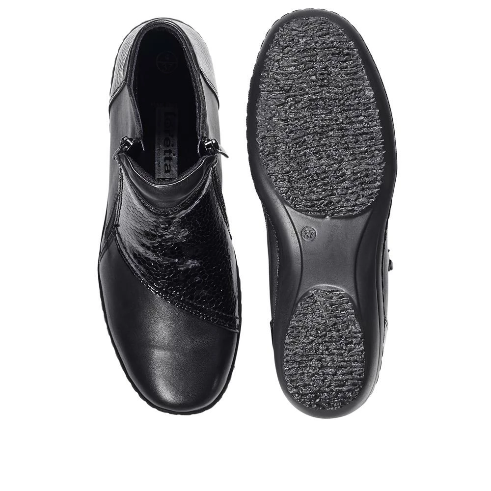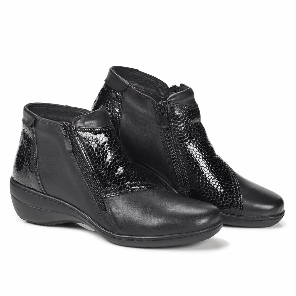 A seasonal must-have for every lady, this is an ankle boot created with an eye-catching mix of smooth and patent leather, a perfect choice for everyday wear. Showcasing dual zip fastens for fuss free dress, cushioned leather insole and lightweight sole, so you can step in complete comfort.