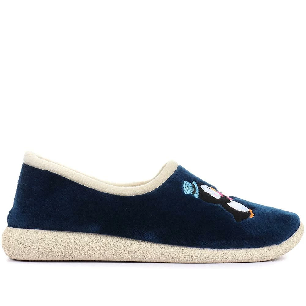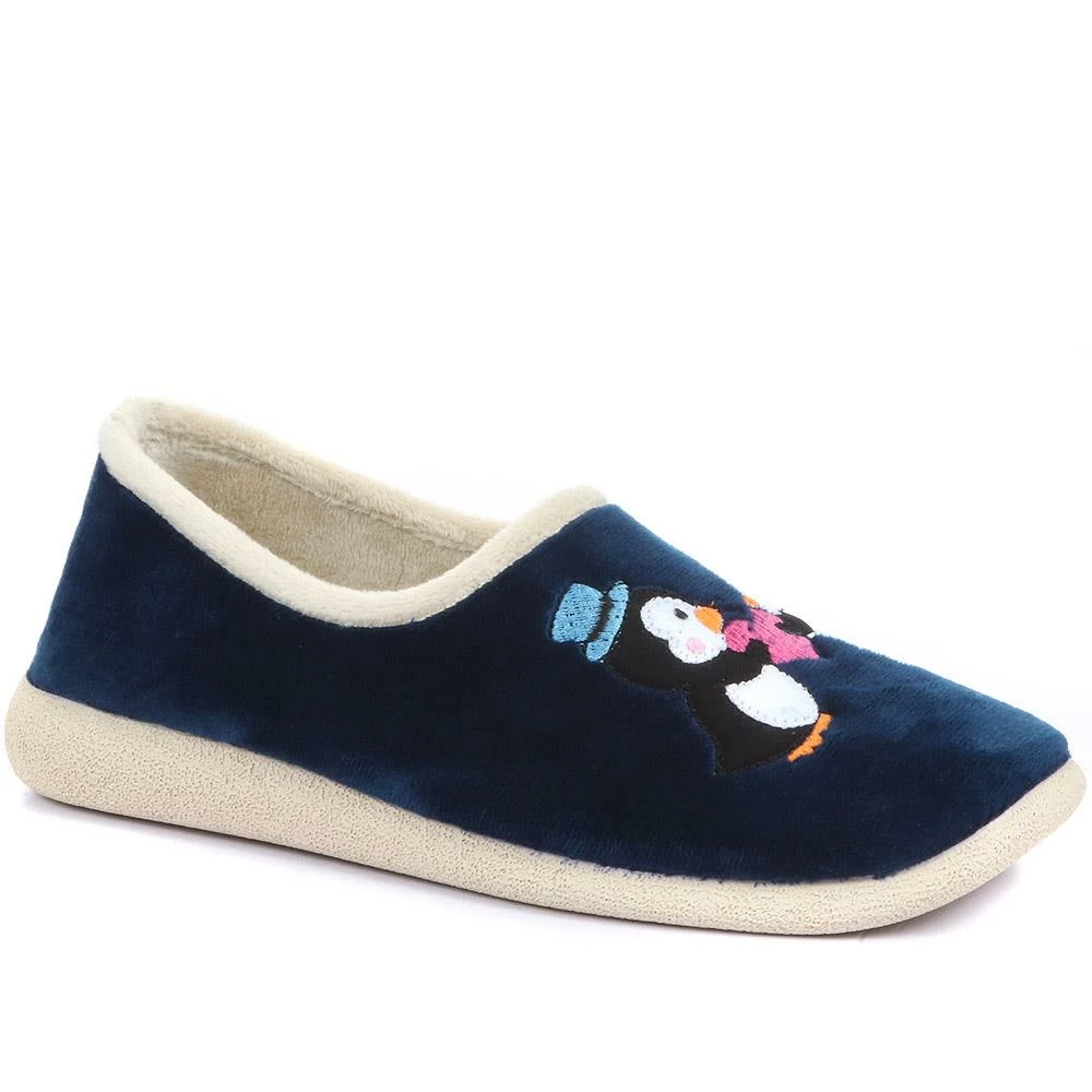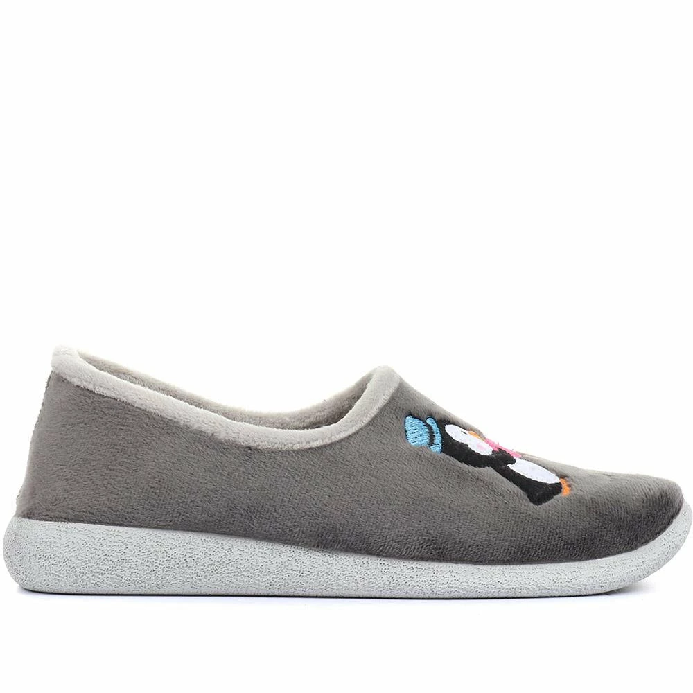 Take the chill out of the changing seasons, our full slipper is created with super soft uppers and linings for snug, cosy comfort. Created with a fun embroidered penguin design across the toe, poised on a gripped rubber sole with lightweight and flexible properties.