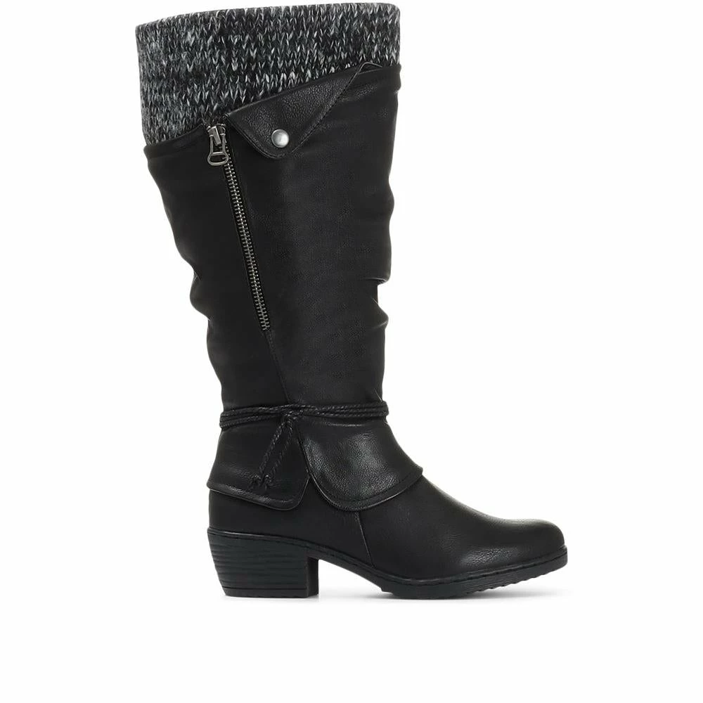 A wide fitting knee high boot created with timeless slouch design and elegantly detailed with a knitted cuff design for relaxed, casual appeal. Sitting on a low stacked heel and lined with extra soft faux fur linings that give lasting cosy comfort, the full length side zip fastening makes the boot easy to pull on and off, perfect for your busy everyday.